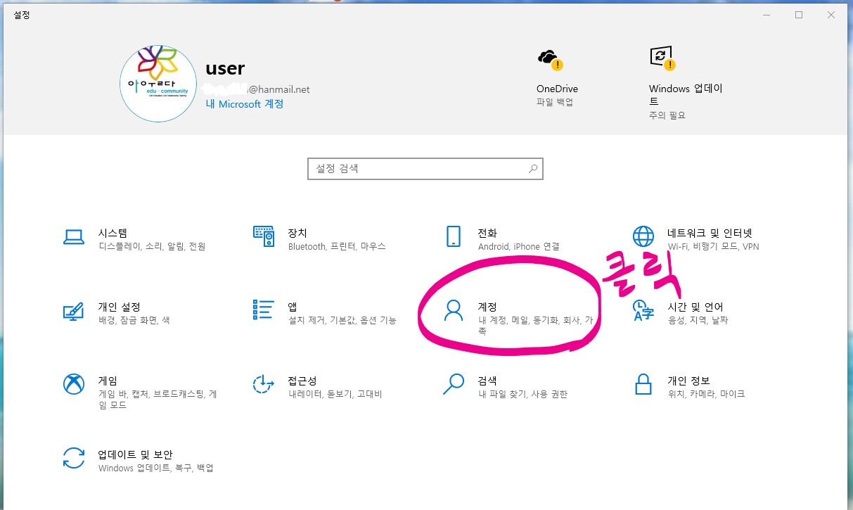 3. 가운데 보이는 《계정》을 클릭합니다.