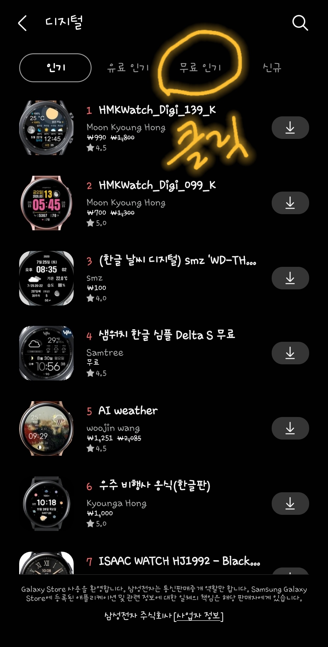 《한글시계》를 다운 받고, 갤럭시 웨어러블 본화면으로 돌아옵니다.