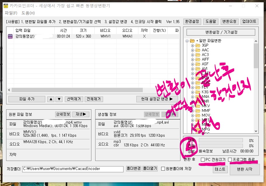 10. 변환 후에 PC전원이 꺼지길 바라면 체크를, 프로그램만 종료되길 원하면 체크를👌