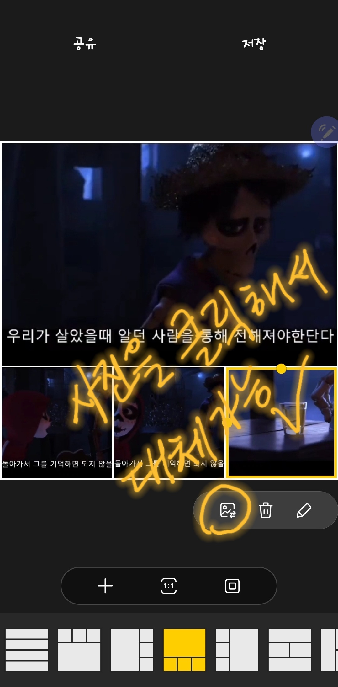 3. 콜라주 화면에서 사진을 클릭하면 《대체》가 가능합니다. 아쉬운 점은 사진을 클릭해서 이미지 이동이 되지않는다는 점🥵