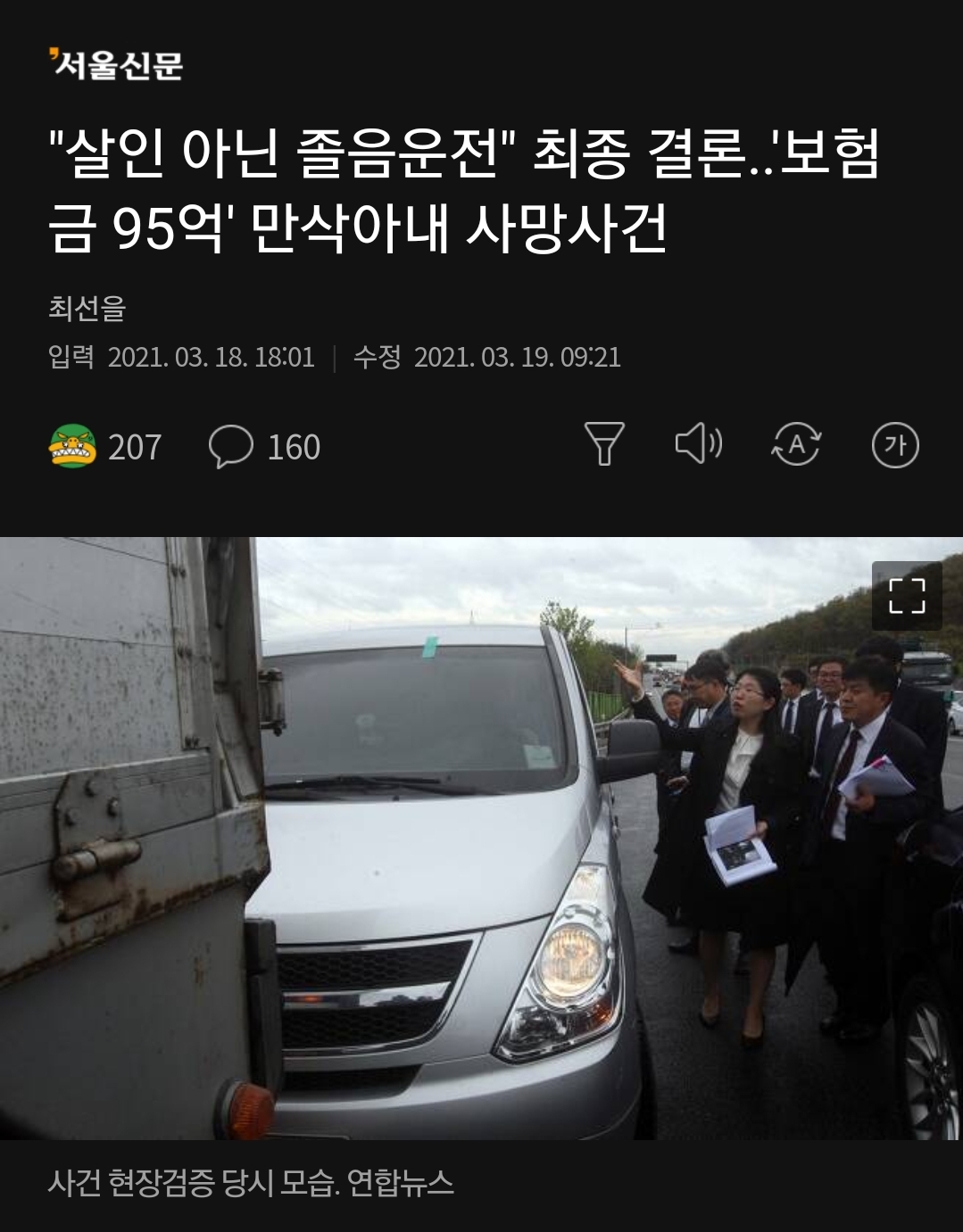 95억원에 달하는 보험금으로 관심을 모은 캄보디아 출신 만삭 아내 사망 교통사고의 원인이 ‘살인’이 아닌 ‘졸음운전’으로 최종 결론이 났다고 합니다.