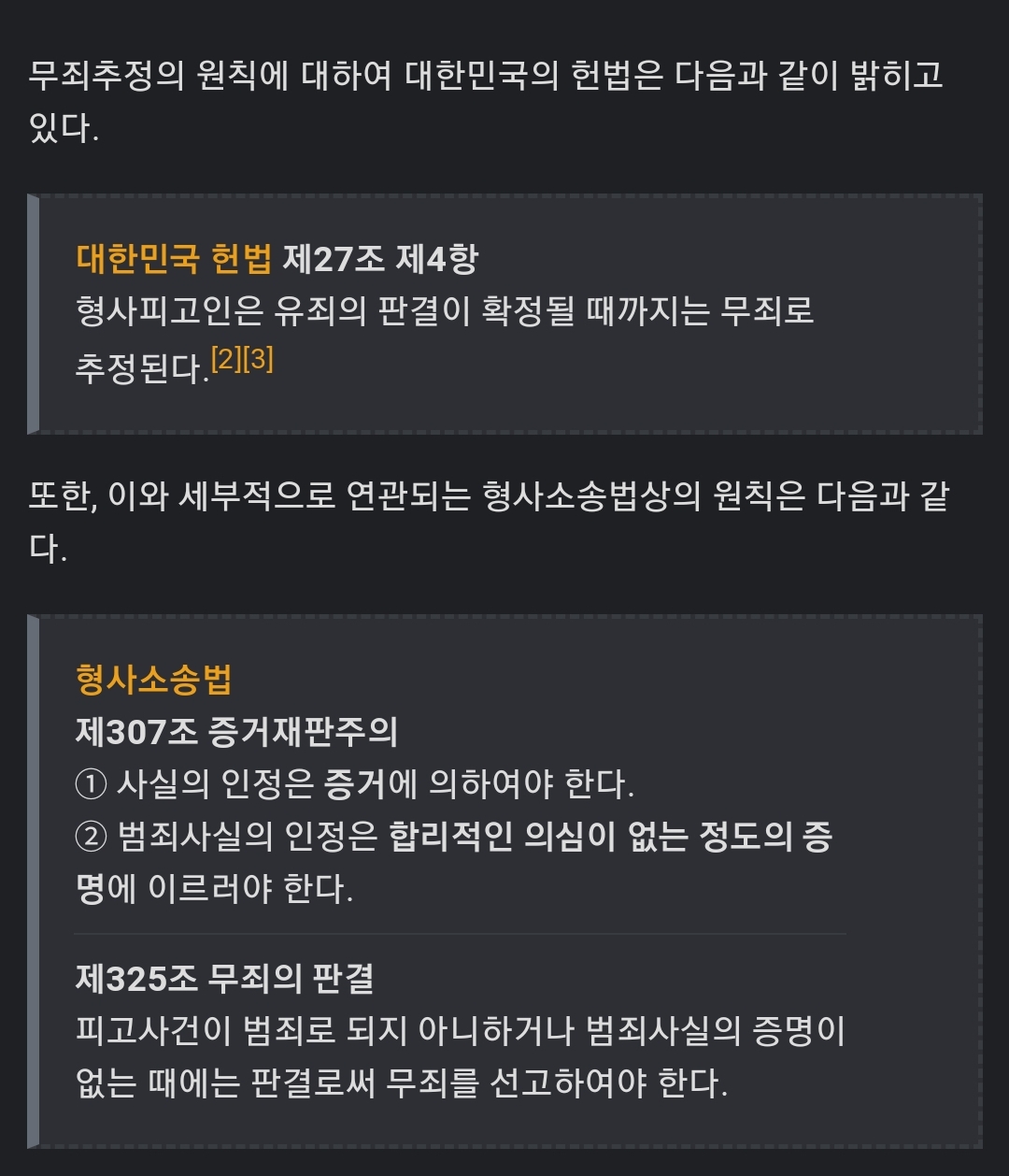 모든 형사피의자는 자신의 변호에 필요한 모든 것이 보장된 공개 재판에서 법률에 따라 유죄로 입증될 때까지 무죄로 추정받을 권리를 가진다.(Everyone charged with a penal offence has the right to be presume