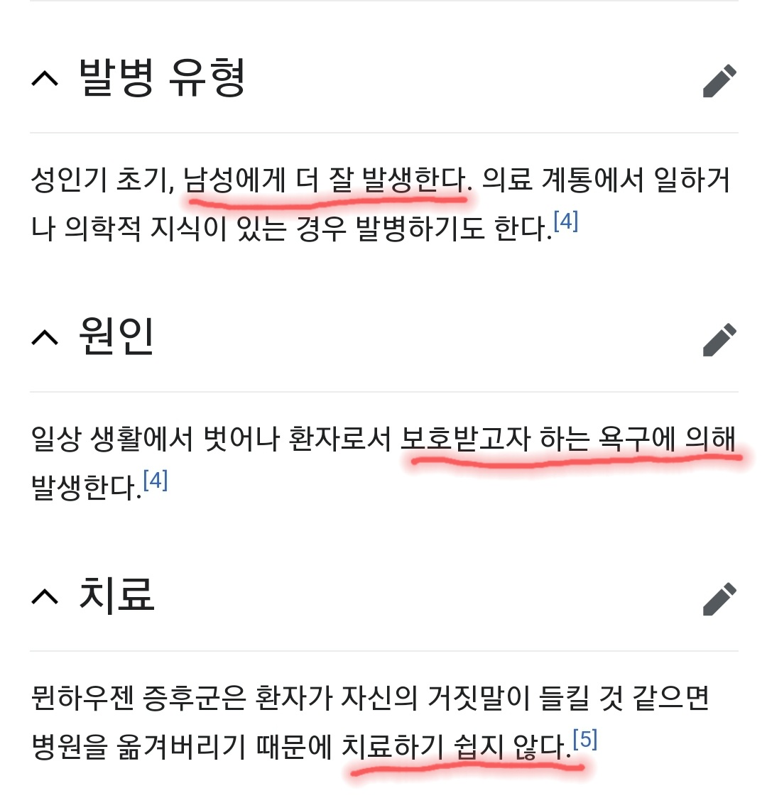 실제로는 앓고 있는 병이 없는데도 아프다고 거짓말을 일삼거나 자해를 하여 타인의 관심을 끌려는 증상으로 신체 증상 장애 중 하나인 뮌하우젠 증후군(Münchausen syndrome)이라는게 있습니다.