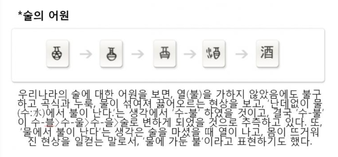 한자로 술 주(酒)자는 항아리 모양의 유(酉)자와 물 수(水)의 합한 글자로, 우리나라에서의 고유 말은 수불이라고 합니다. 즉 《물이 불이 붙는 것으로 변한다》고 수불하다가 수불→수울→술이 되었다고 합니다.