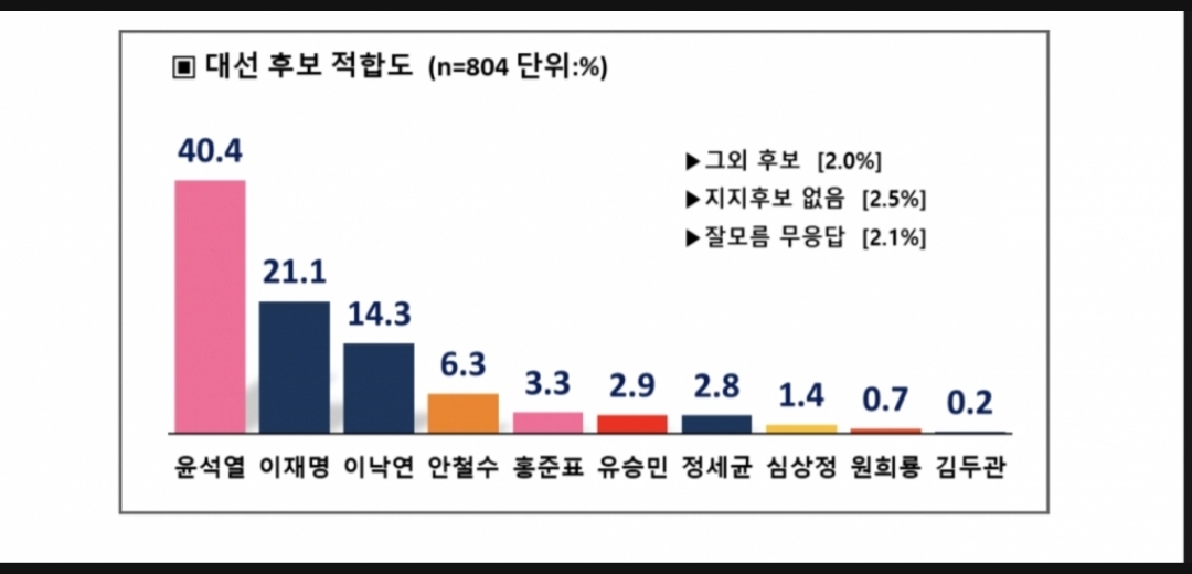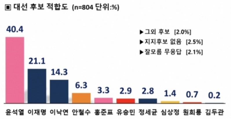 머니투데이와 미래한국연구소가 PNR리서치에 의뢰, 지난달 30일 서울 거주 만 18세 이상 남녀 804명을 대상으로 대선 후보 적합도를 조사해 3일 발표한 결과에 따르면, '차기 대통령 감으로 누가 가장 적합하다고 생각하십니까'라는 질문에 40.4%가 윤 전 총장이라 답했다. 이 지사는 21.1%, 이낙연 전 더불어민주당 대표가 14.3%로 뒤를 이었다.(기사中)