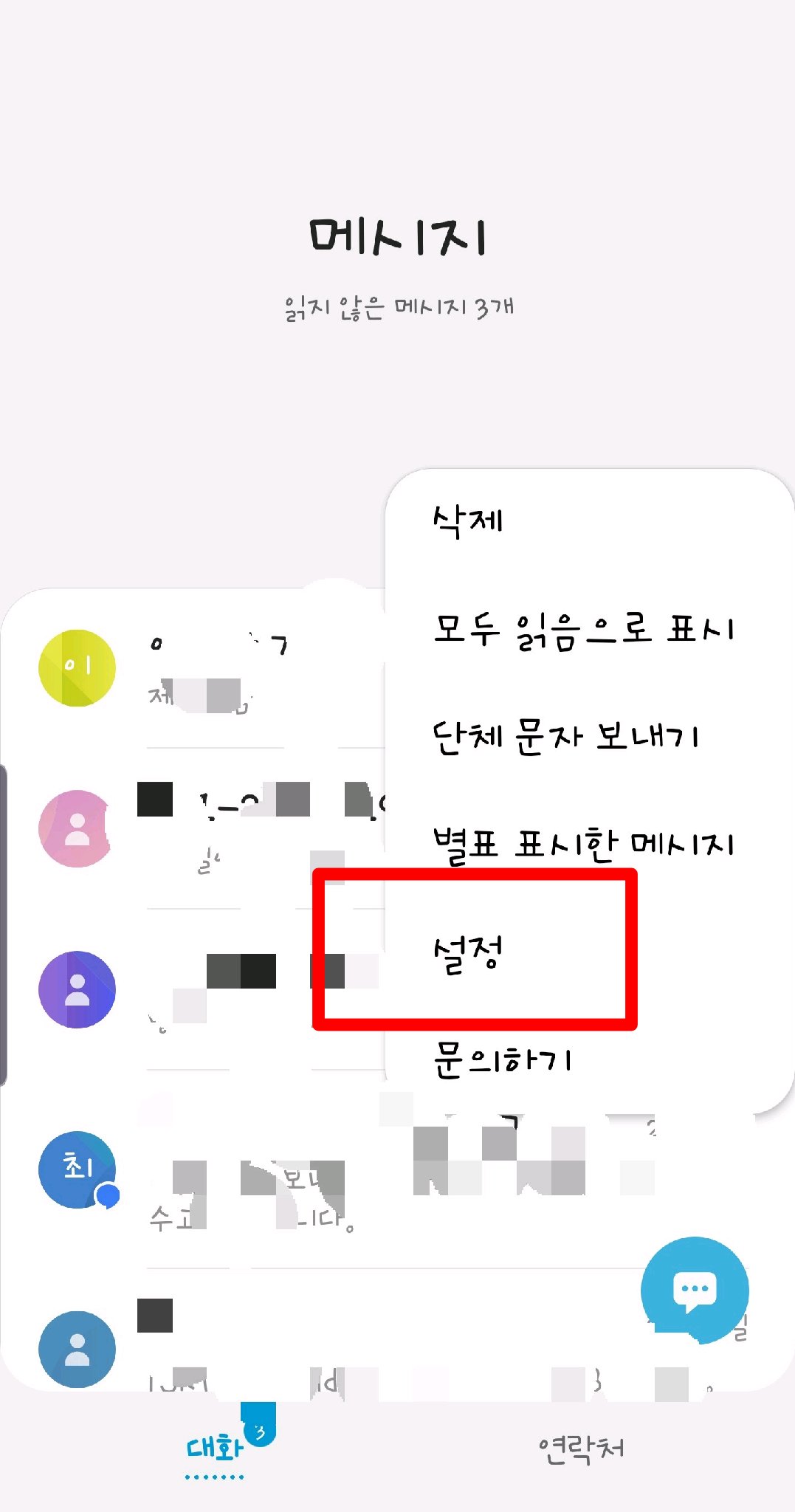 2. 문자(메시지)로 들어갔으면 이번에는 설정이 있는 곳으로 들어 갑니다