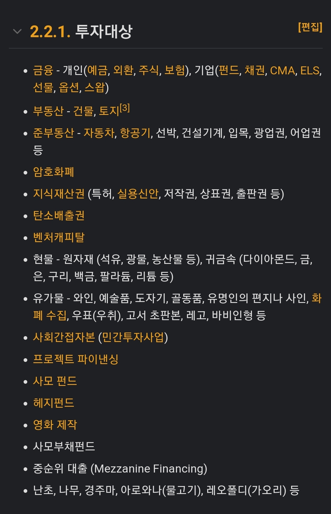 나무위키에서 말하는 재테크 투자대상을 보니...