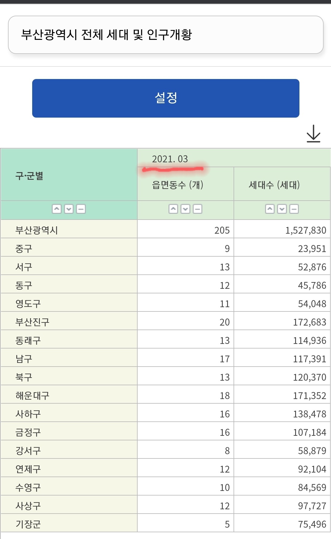 * 통계명 : 인구밀도(구별)
