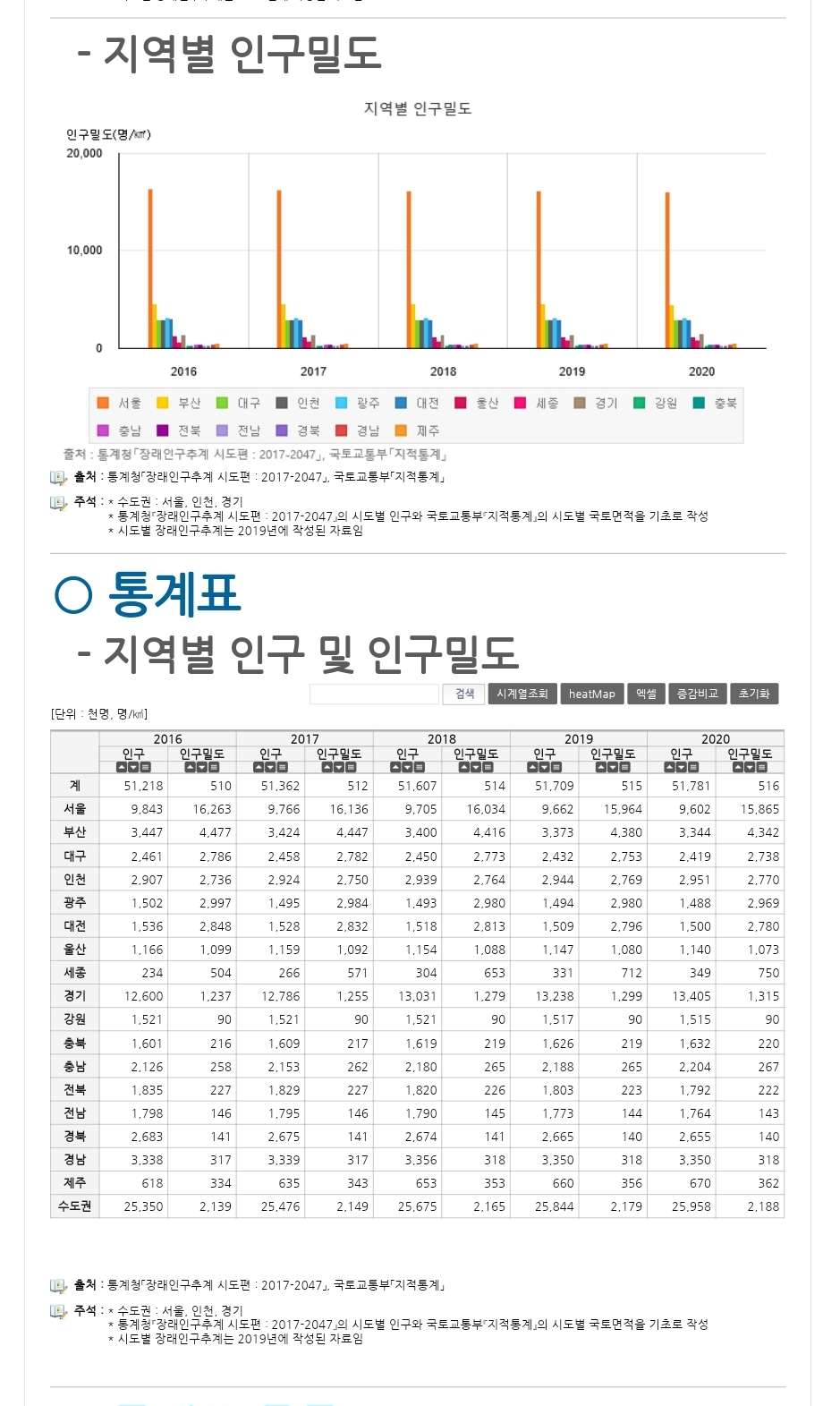 지역별 인구 및 인구밀도 : 지표상세화면