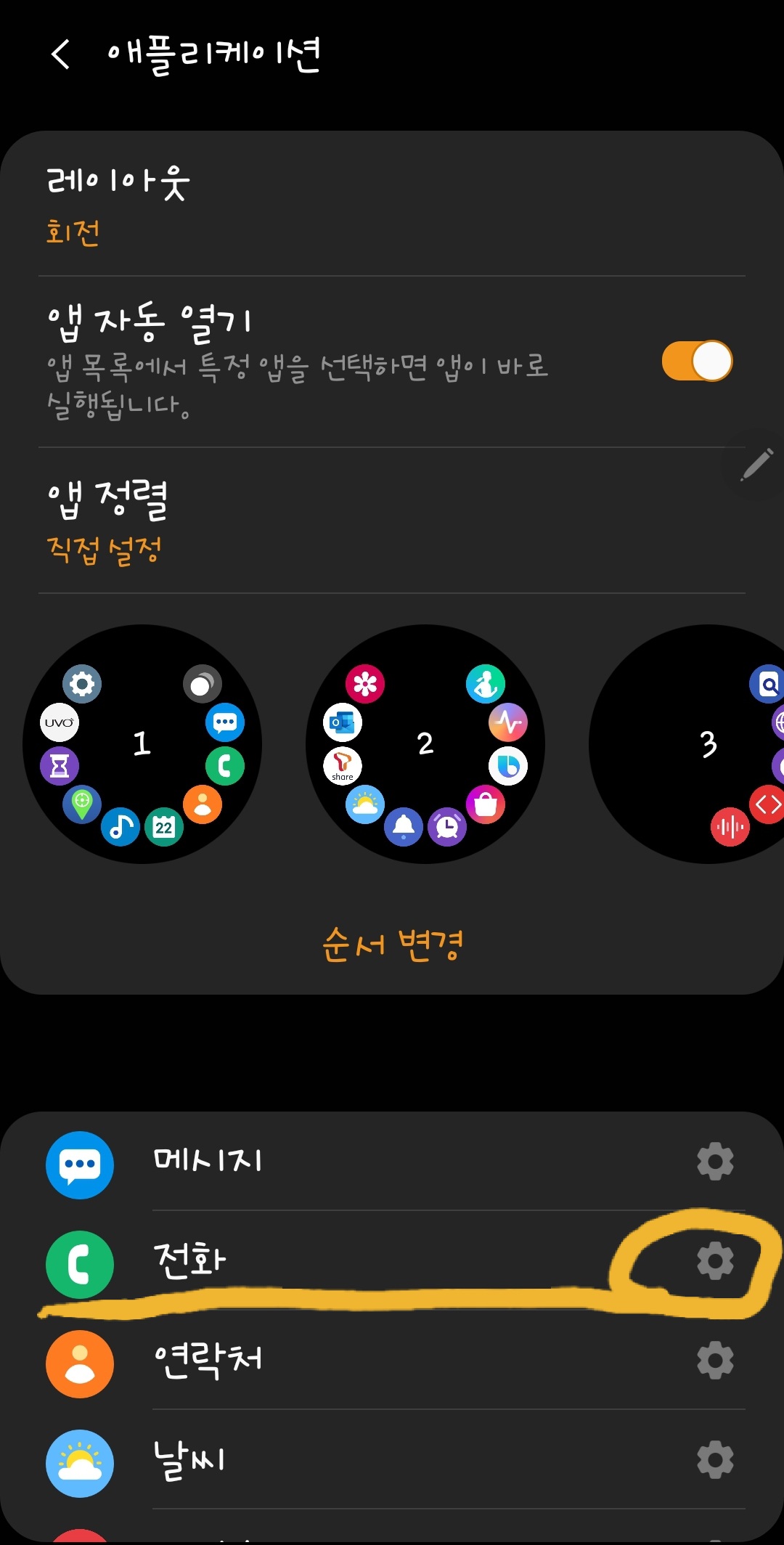 1. 전화가 오면 갤럭시워치 화면에는 발신자가 보이고 아래쪽 노란 동그라미 부분에 문자를 보낼 수 있게 하얀 부분이 나타납니다.