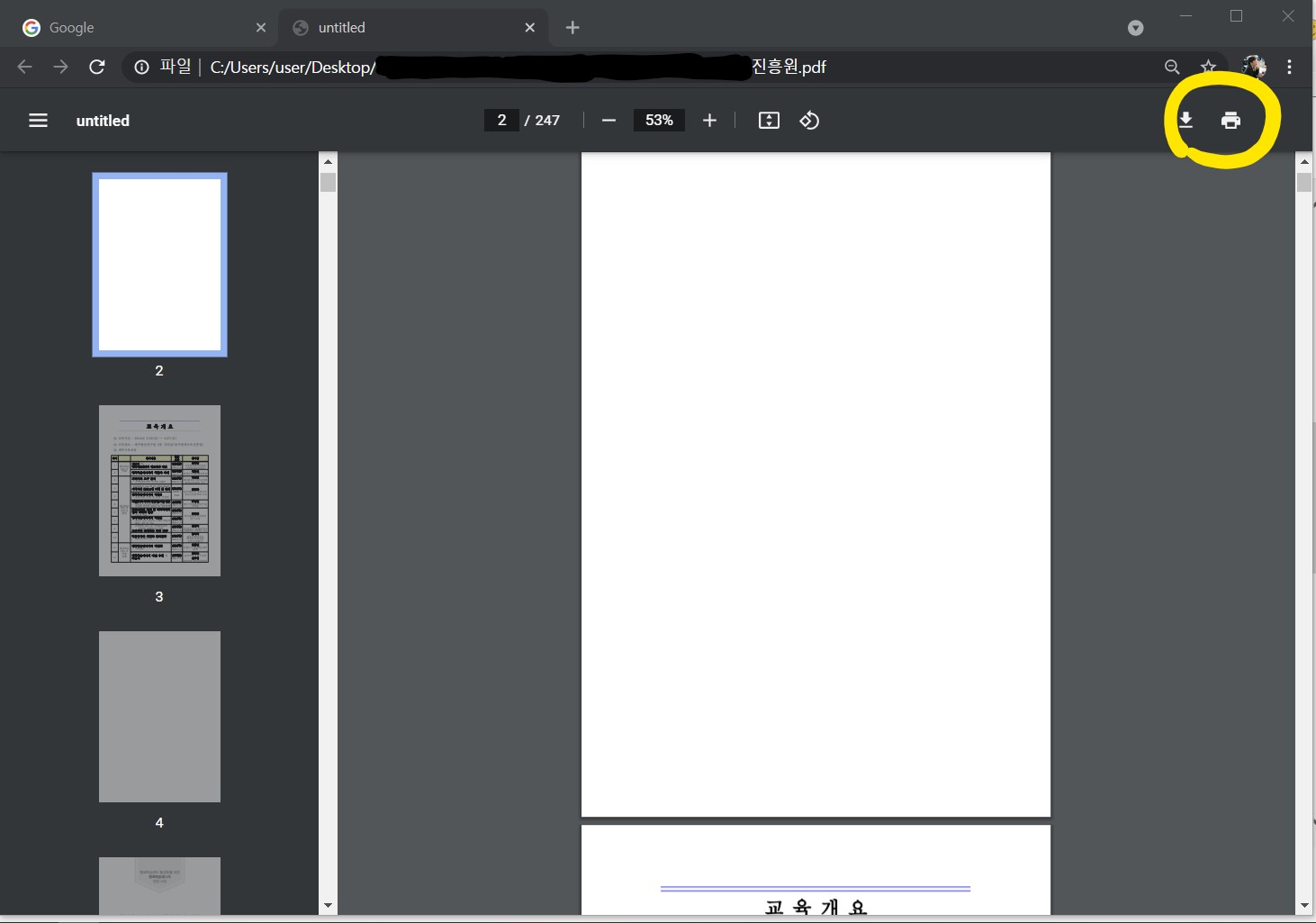 📌 크롬에 pdf 파일이 열리면, 오른쪽 위에 보이는 《인쇄 버튼》을 클릭합니다.
