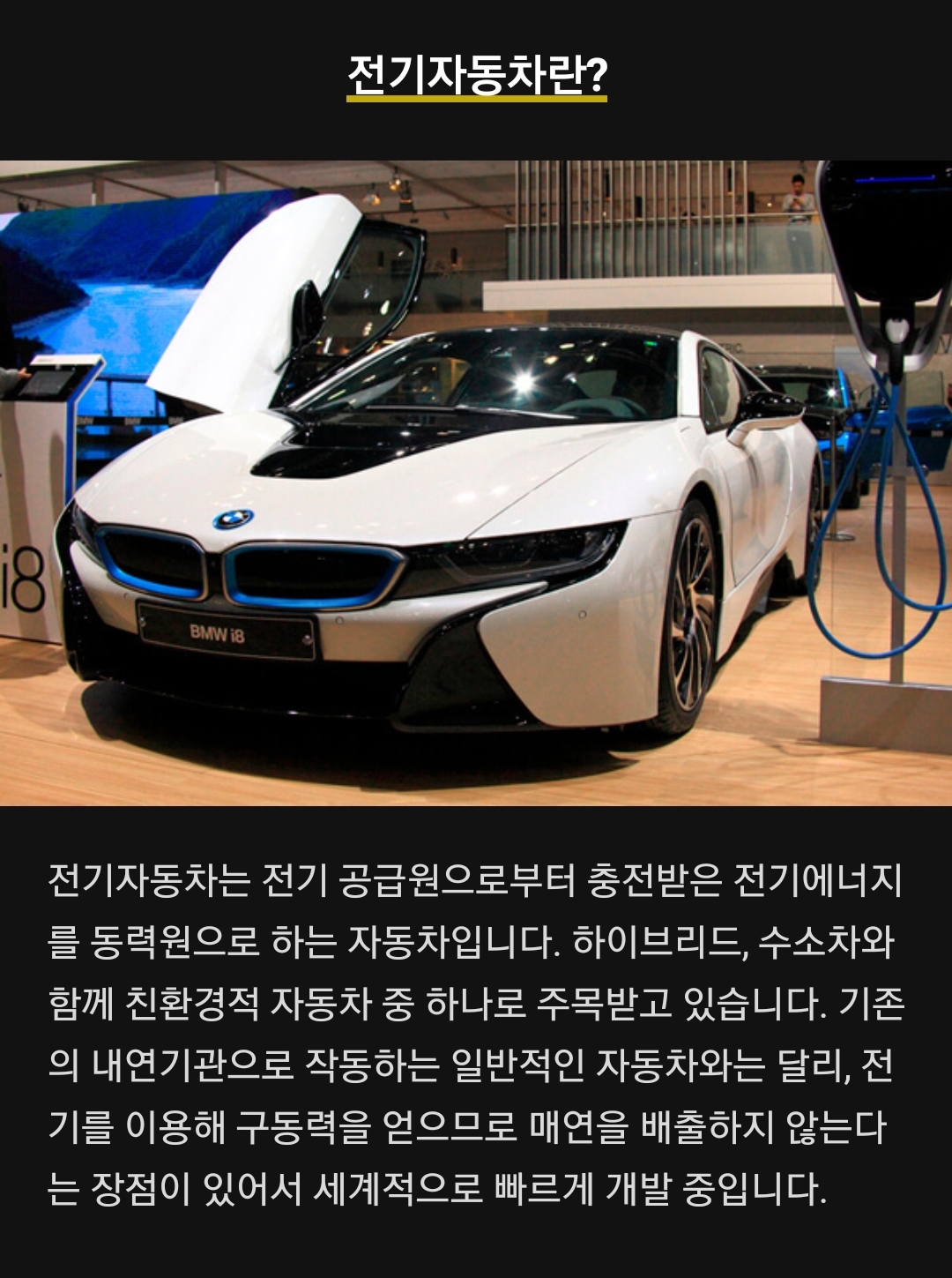 요즘 주목받고 있는 전기자동차는 차기 에너지산업의 핵심이며, 국내를 비롯하여 전 세계에서 관심을 갖고 있습니다. 우리나라도 친환경 자동차의 대중적인 보급을 위해 보조금 지급 등 여러 가지 정책을 진행하고 있는데요. 현재 우리가 타고 다니는 내연기관 자동차와 어떤 점이 다른지, 장점 및 단점은 무엇인지 집중적으로 알아보았습니다.