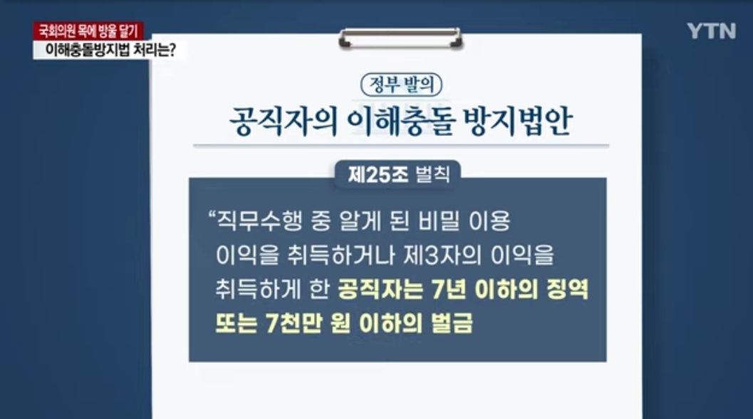 현재 정부가 내놓은 이해충돌방지법안은 공직자가 직무상 비밀을 이용해 자신이나 제 3자가 이익을 얻게 할 경우 7년 이하의 징역 또는 7천만 원 이하의 벌금에 처하도록 규정하고 있습니다.
