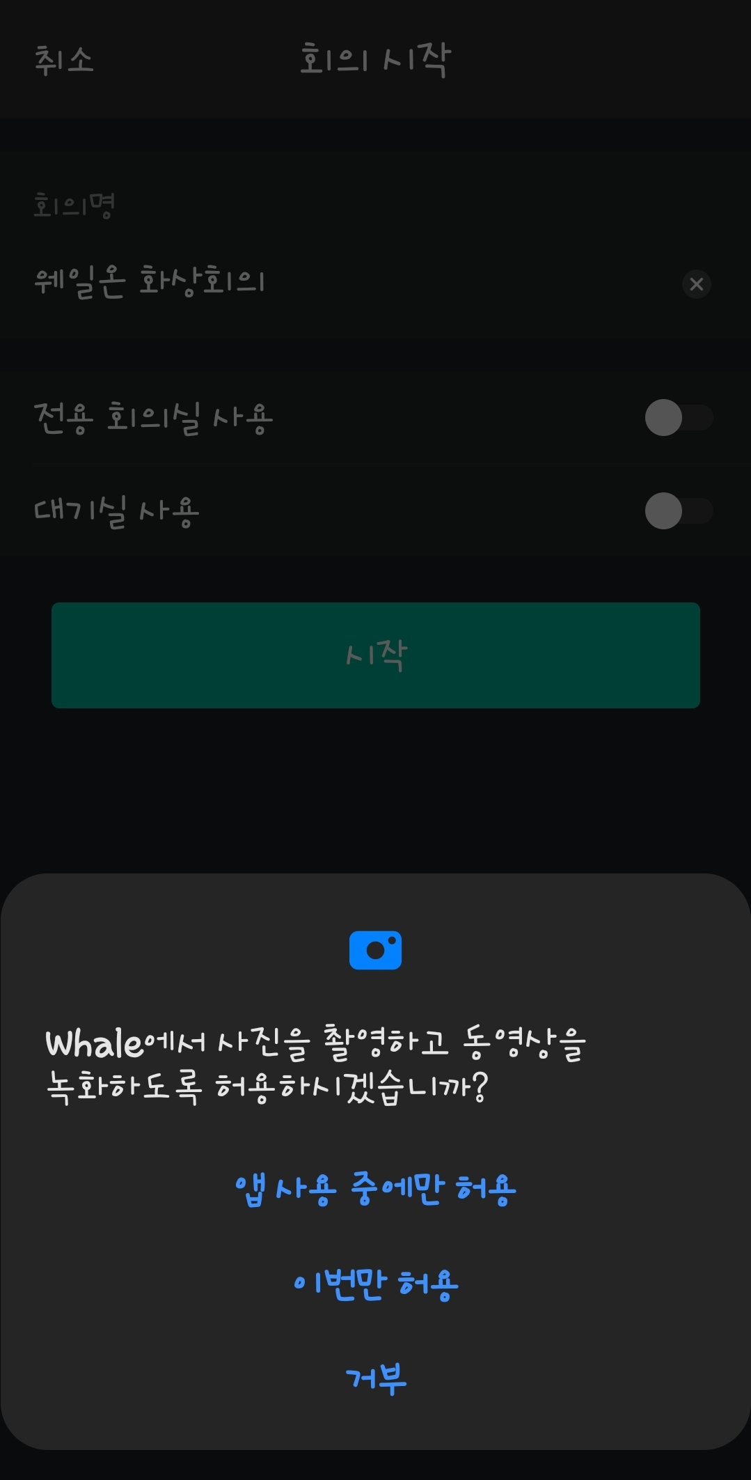 17. 회의실 《이름 설정》 및 《기타 선택》 적용 후 《시작하기》 클릭.