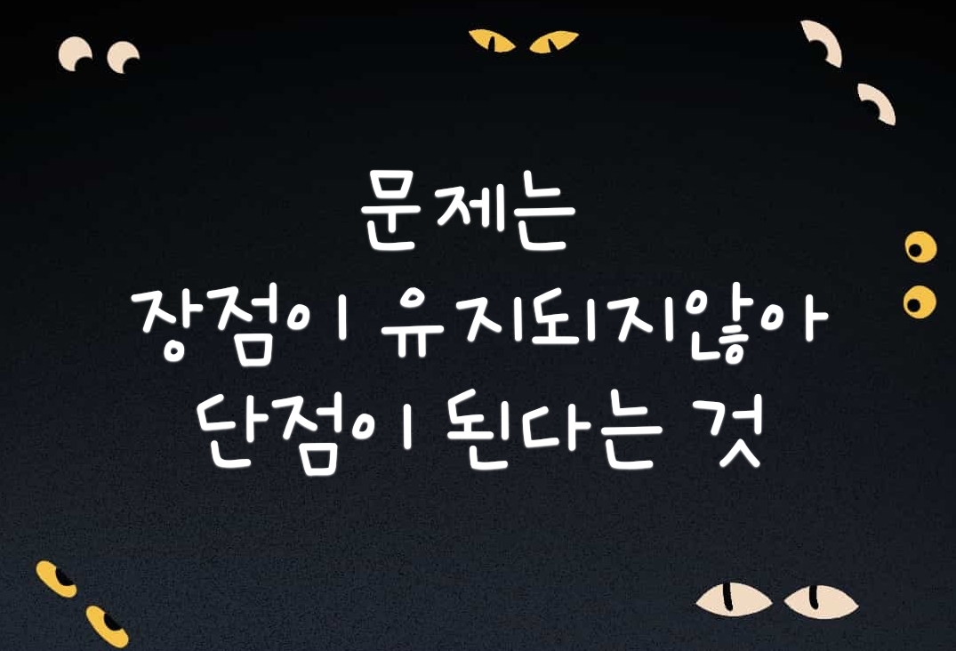 《단점도 단점이요, 장점도 단점이요》가 되는 경우 때문인데요, 장점이 유지되지 않고 지켜지지 않아 어느새 단점으로 홀라당 넘어가 버린 모습을 주변에서 쉽게 볼 수 있다는 뜻입니다.