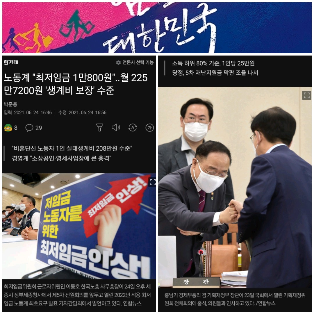 6월24일 기사에 노동계에서 최저임금 1만800원(월225만7200원 생계비 보장)을 주장하고 나섰습니다. 그런데 같은 날 소득 하위 80% 이하 가구는 1인당 25만원(5인가구 125만원)의 5차 재난지원금을 받을 전망이라는 기사가 올라왔습니다.