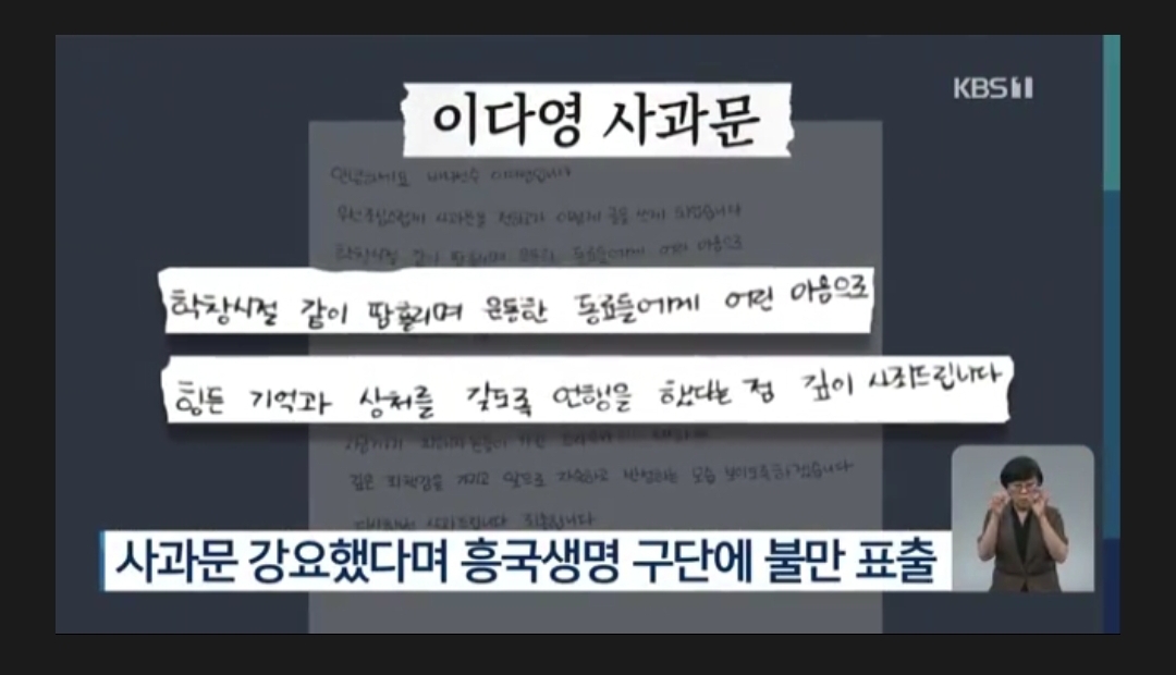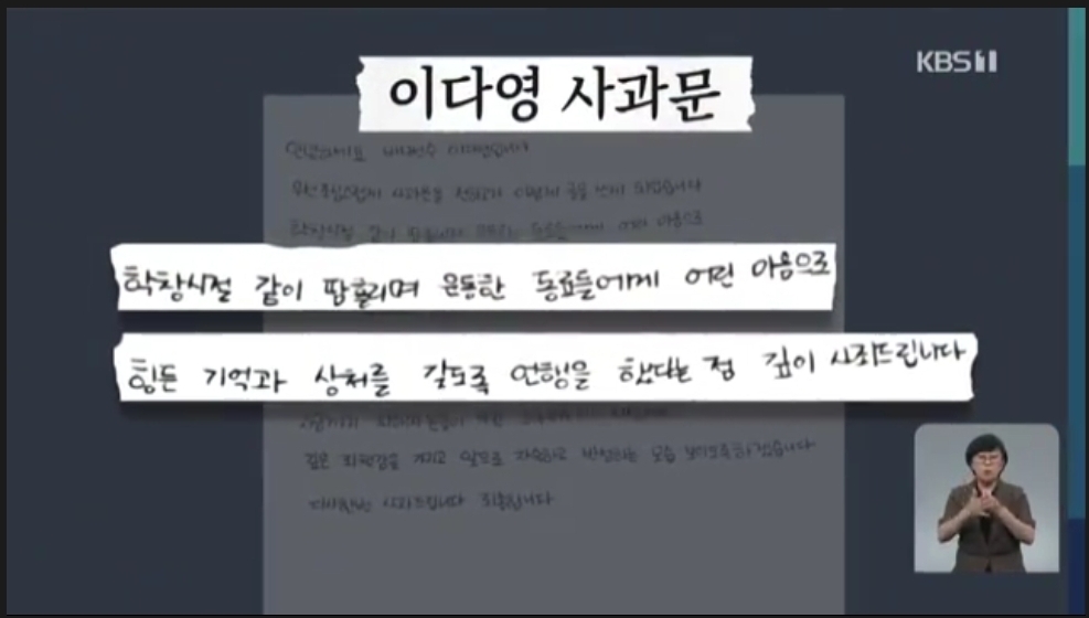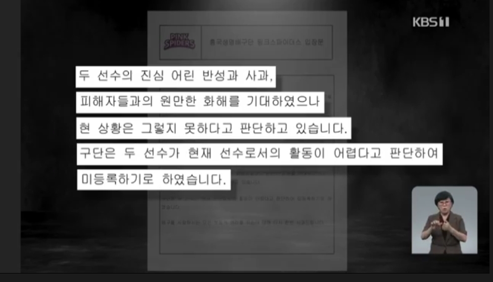 ["저는 아닌 것에 대해선 분명히 밝히고 싶었어요. 하지만 구단에선 무조건 사과문을 써야한다고 요구했고, (사과문) 문구도 다 보내줘서 그대로 받아 적어 썼거든요. 구단에서는 그렇게 해야 빨리 무마가 된다해서..."]