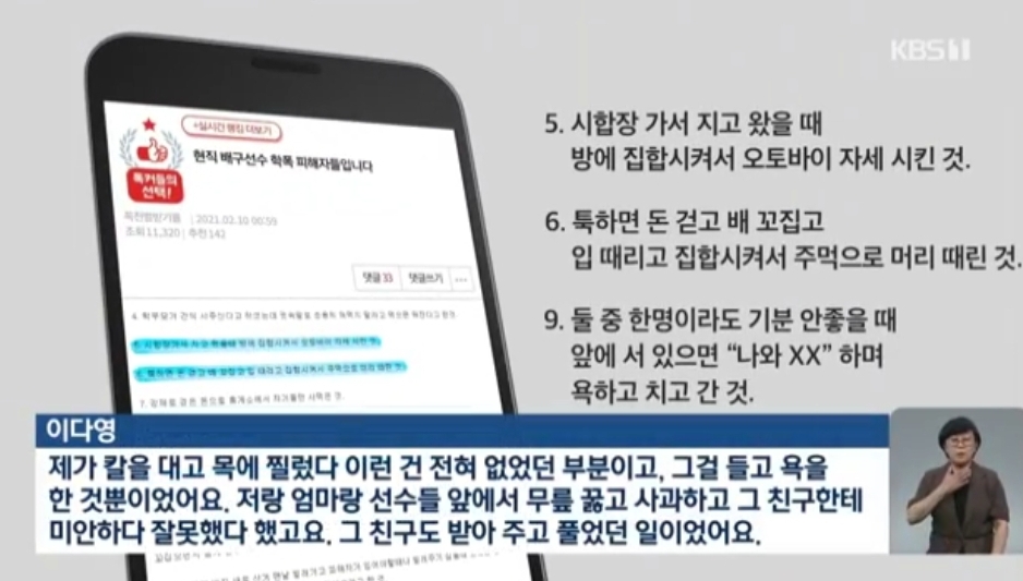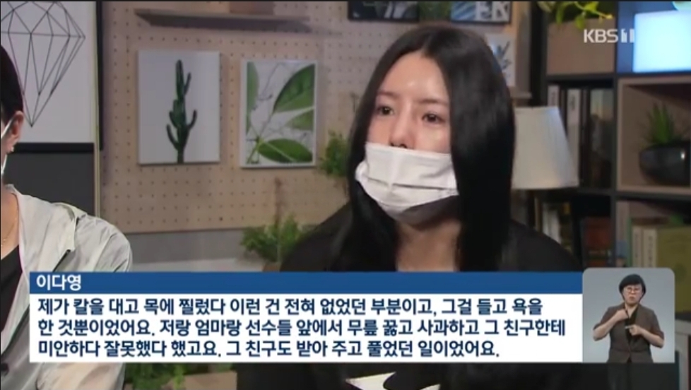 [이다영 : "제가 칼을 대고 목에 찔렀다 이런건 전혀 없었던 부분이고, 그걸 들고 욕을 한 것 뿐이었어요. 저랑 엄마랑 선수들 앞에서 무릎 꿇고 사과하고 그 친구한테 미안하다 잘못했다 했고 그 친구도 받아주고 풀었던 일이었어요."]