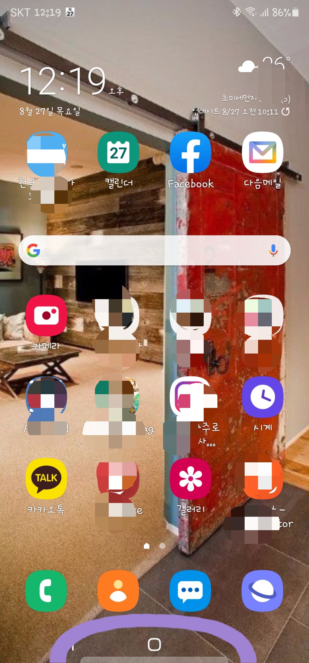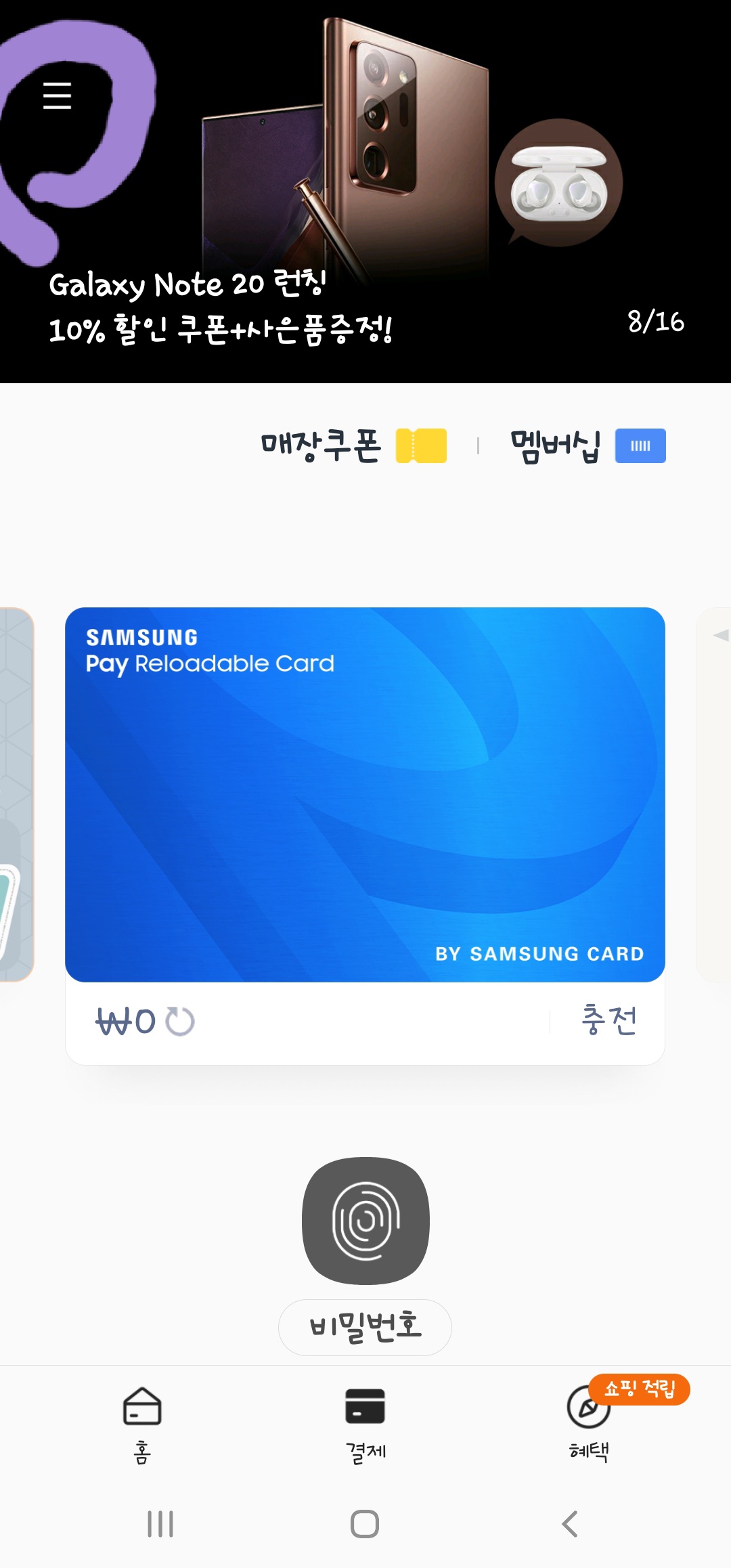 1. 갤럭시노트20 울트라 기본화면의 아래에서 삼성페이가 나오는 부분을 찾습니다.