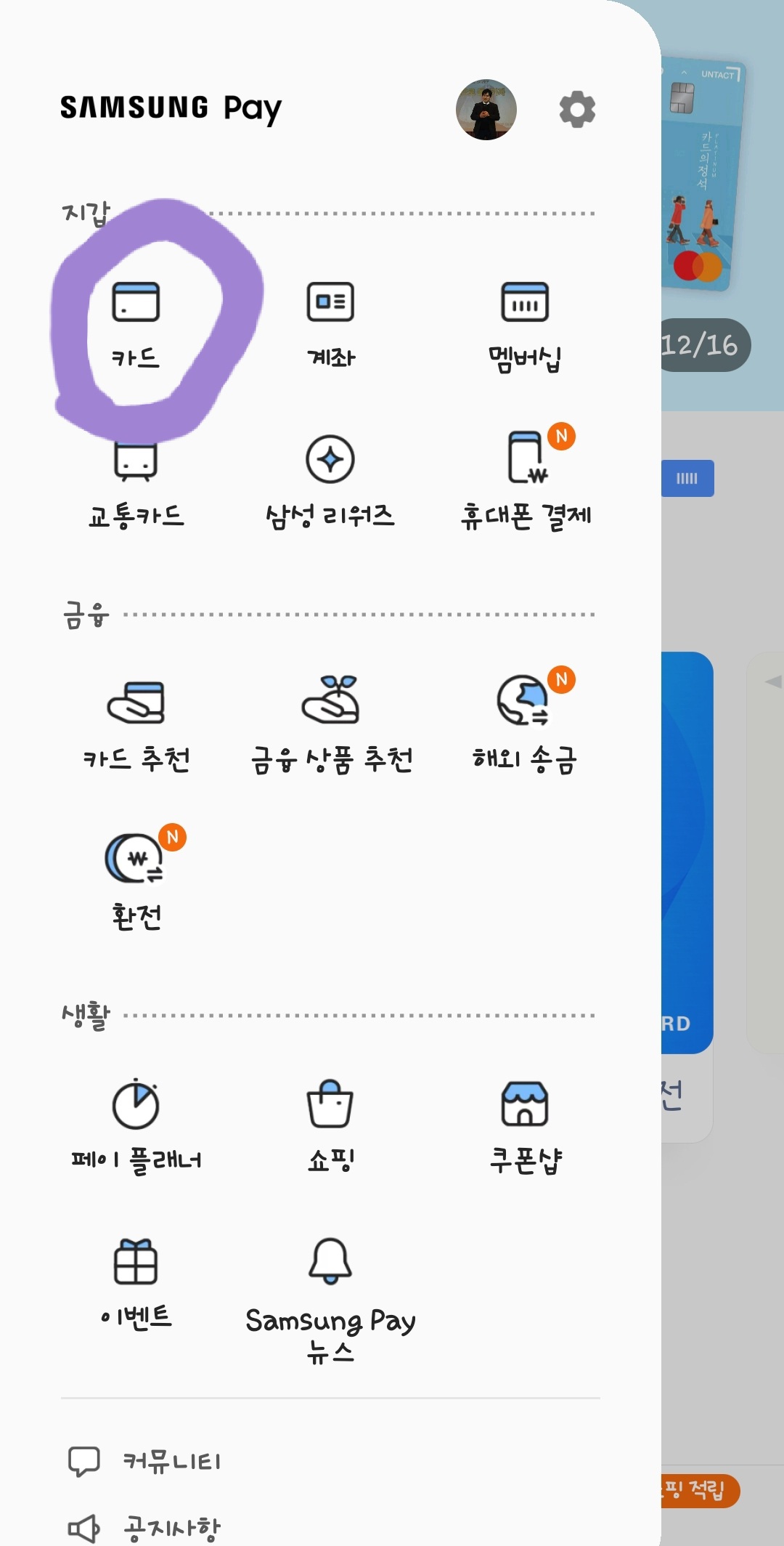 3. 《카드 추가하는 방법》은 열린 화면에서 왼쪽 위에 보이는 三(삼선)부분을 클릭해 줍니다.