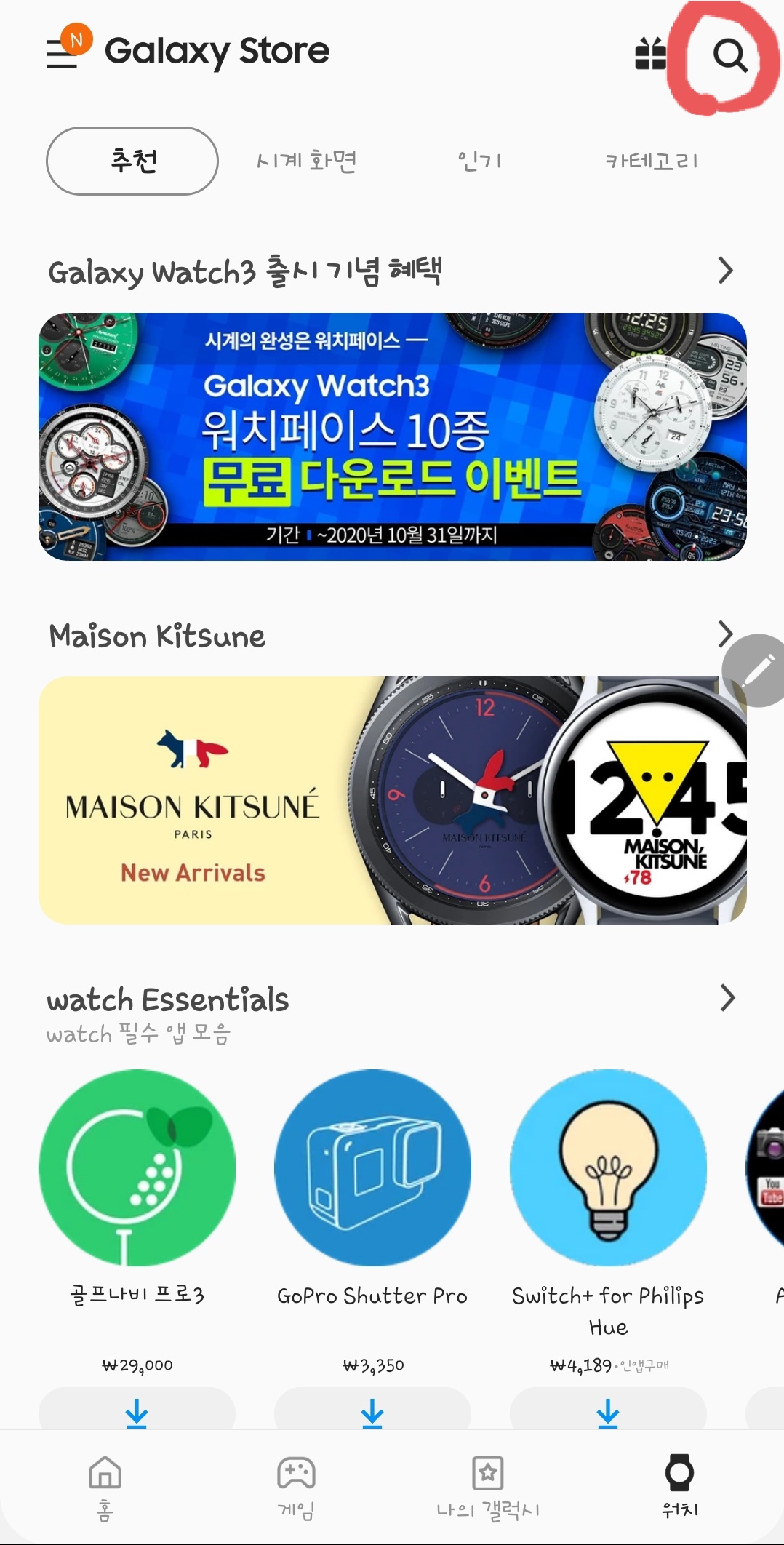2. 갤럭시 스토어를 들어가서 오른쪽 아래의 《워치》를 열어 줍니다.