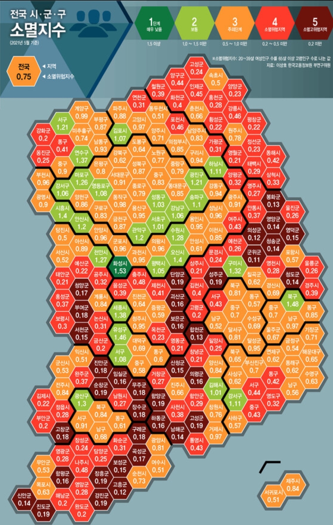 우리나라(전국) 전체 평균 소멸위험지수는 0.75로 지난해(0.8)에 이어 주의 수준이었다.