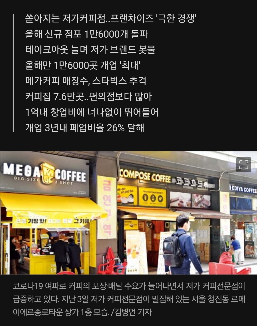 올해 전국에서 새로 문을 연 커피전문점이 사상 처음으로 1만6000개를 넘어설 전망이다. 하루평균 44개의 카페가 쏟아진 셈이다. 10개 중 3개는 33㎡ 이하 규모의 소형 저가 커피 매장인 것으로 나타났다. 포장·배달문화 확산 붐을 타고 저가 커피전문점이 단기간에 급증하면서 과당 경쟁 우려가 커지고 있다. (기사中)
