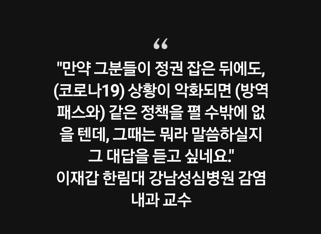 "만약 그분들이 정권 잡은 뒤에도, (코로나19) 상황이 악화되면 (방역패스와) 같은 정책을 펼 수밖에 없을 텐데, 그때는 뭐라 말씀하실지 그 대답을 듣고 싶네요." 이재갑 한림대 강남성심병원 감