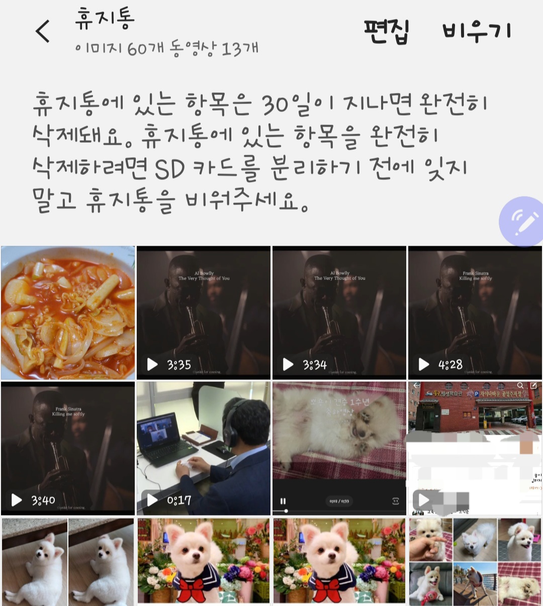 5. 휴지통을 누르고 들어가면 내가 삭제했던 사진과 동영상이 여기에 똭~~🤩