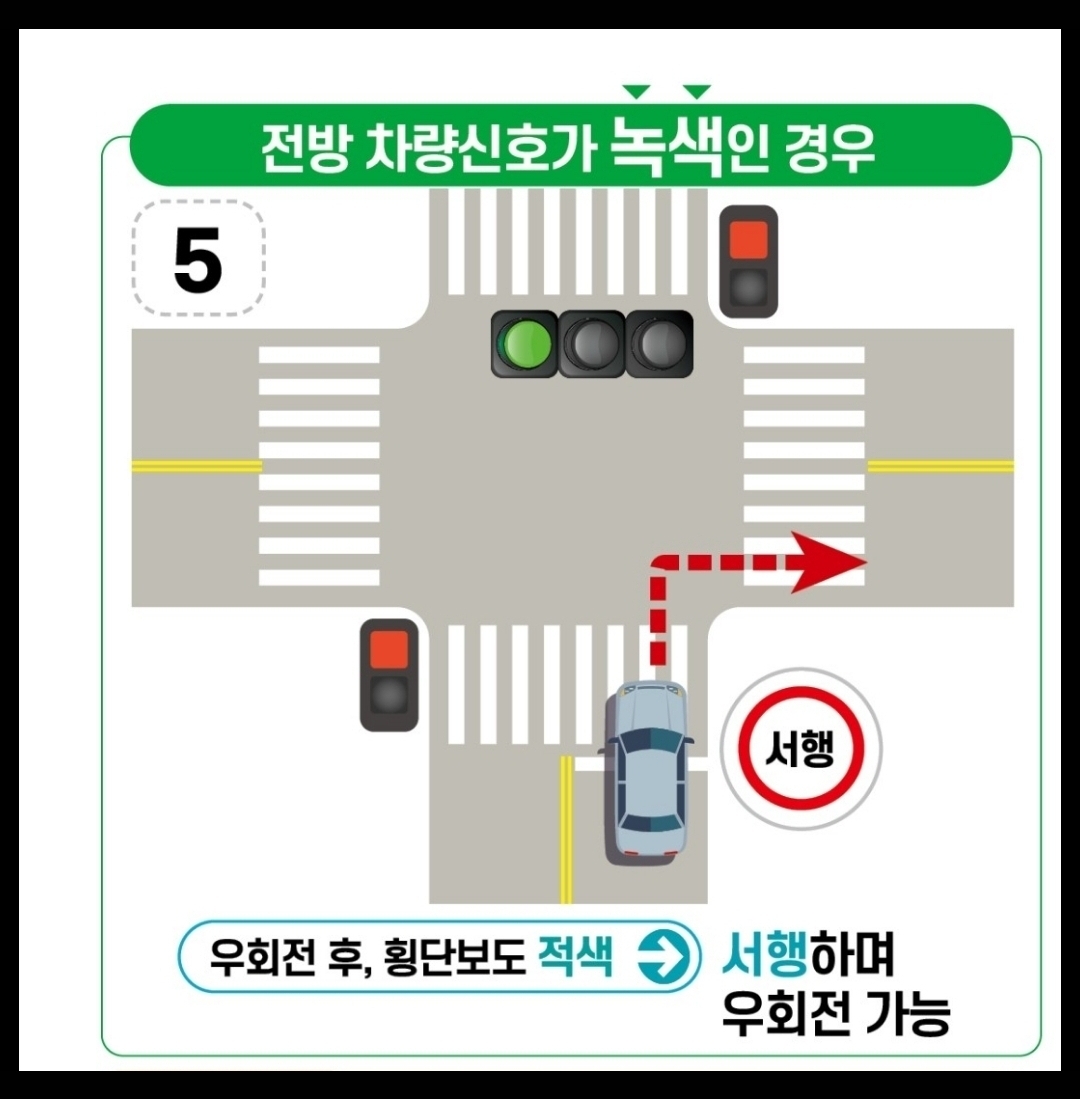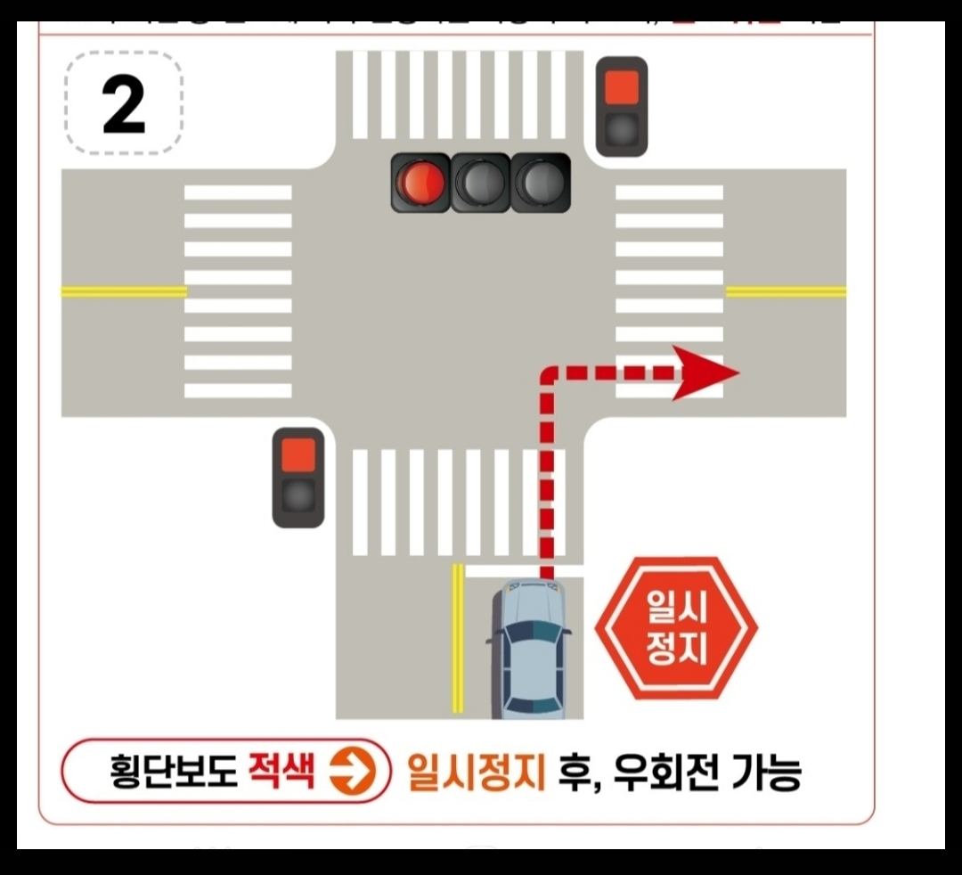 이번에 공포된 개정 도로교통법 시행규칙에 따르면 운전자는 차량 신호등이 적색일 때 우회전 하는 경우 정지선, 횡단보도 및 교차로 직전에서 정지한 후 우회전 해야 한다.(기사中)