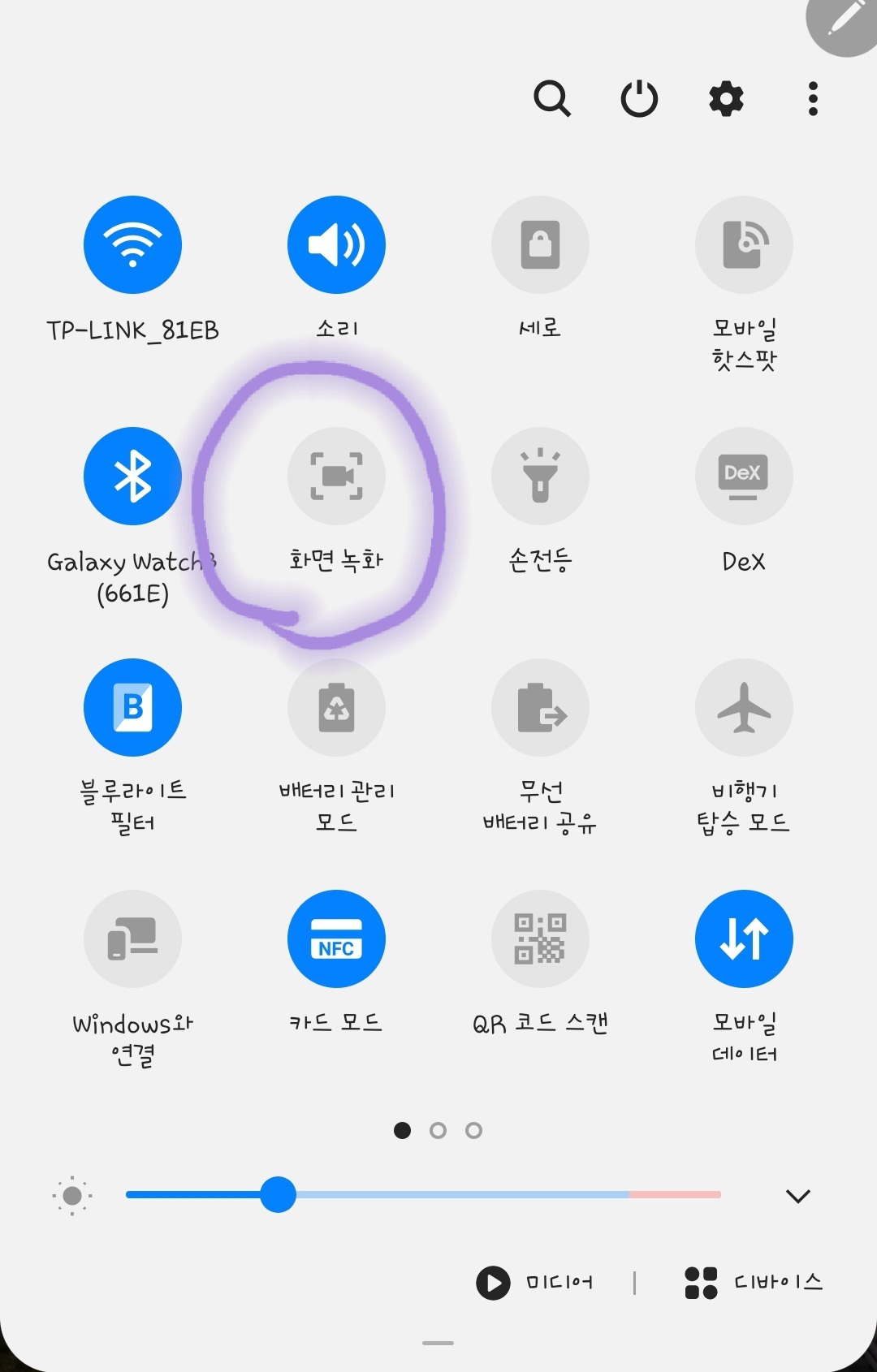 12. 거치대에 장착하고 갤럭시노트20 울트라 《홈화면》을 아래로 쓸어내려, 기능들이 잔뜩 있는 창을 열어 줍니다.