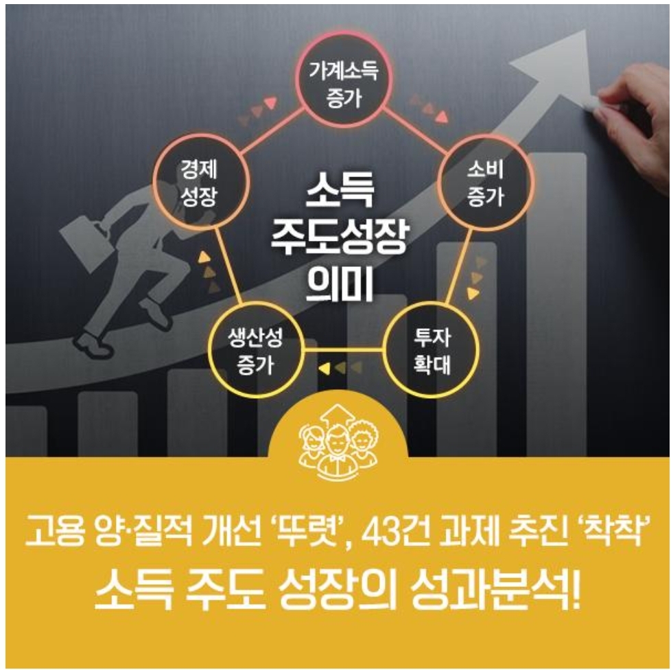 소득주도성장은 가계소득 증대, 가계지출 경감과 안전망·복지 강화를 기반으로 일자리를 늘리고, 성장잠재력을 확충하는 동시에 소득분배를 개선하는 경제성장입니다.