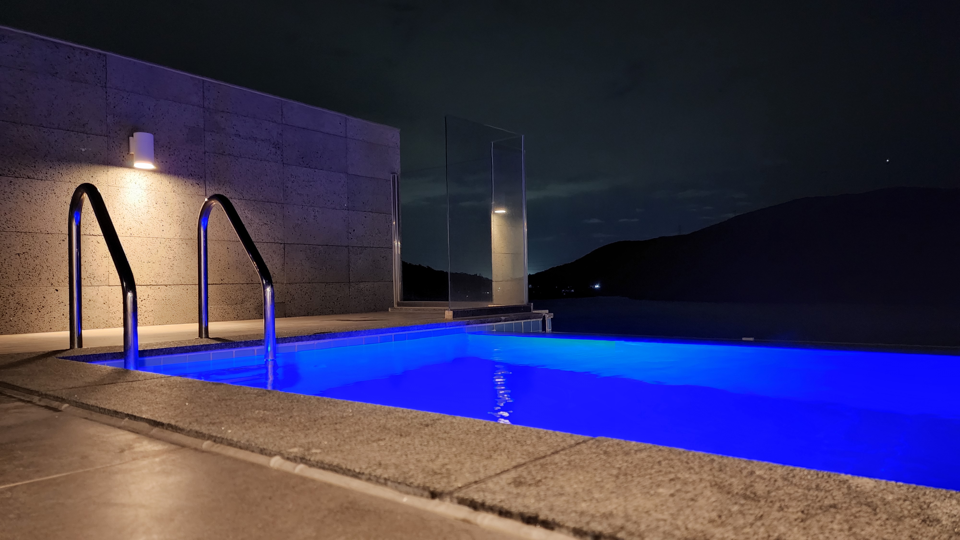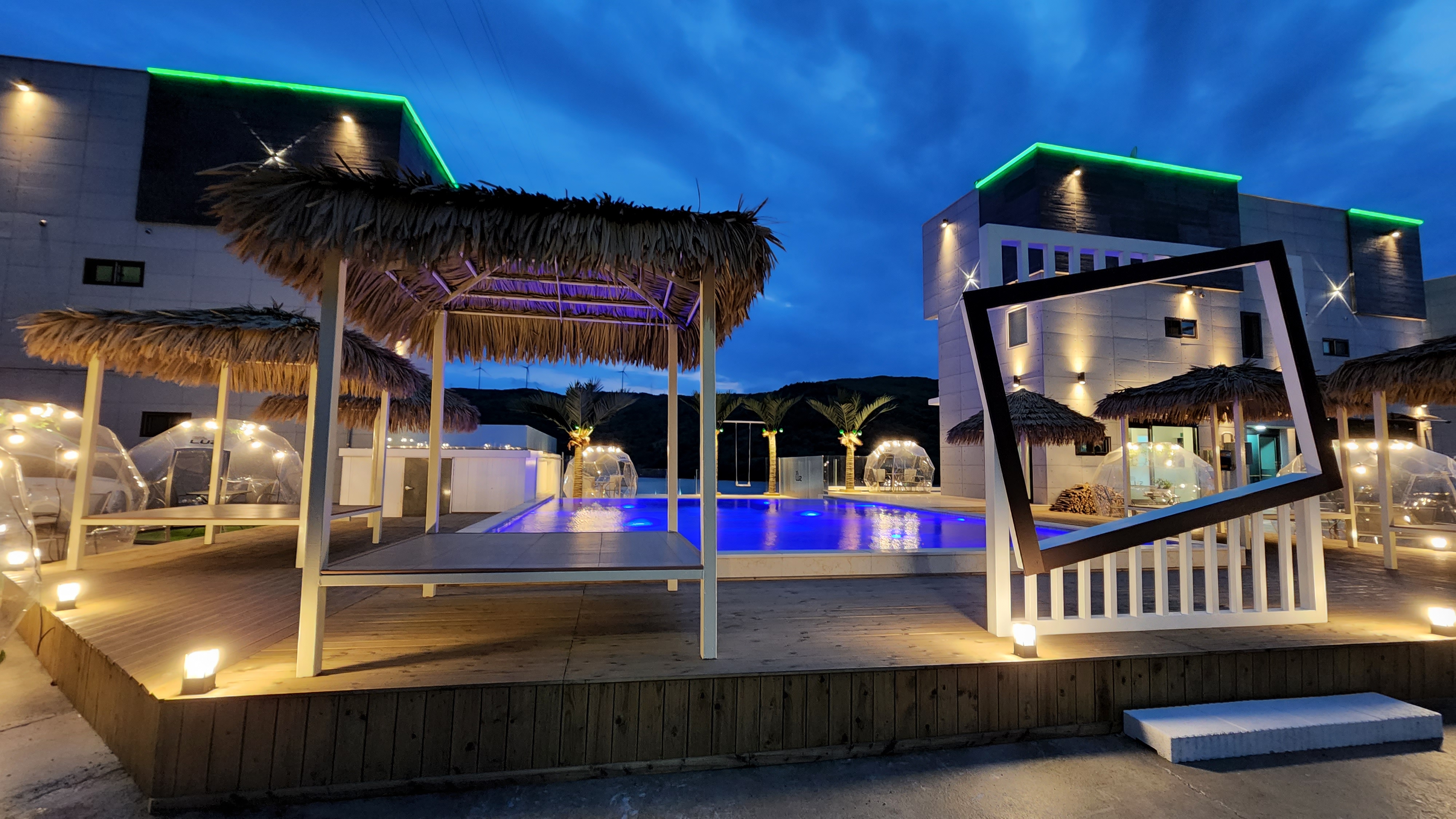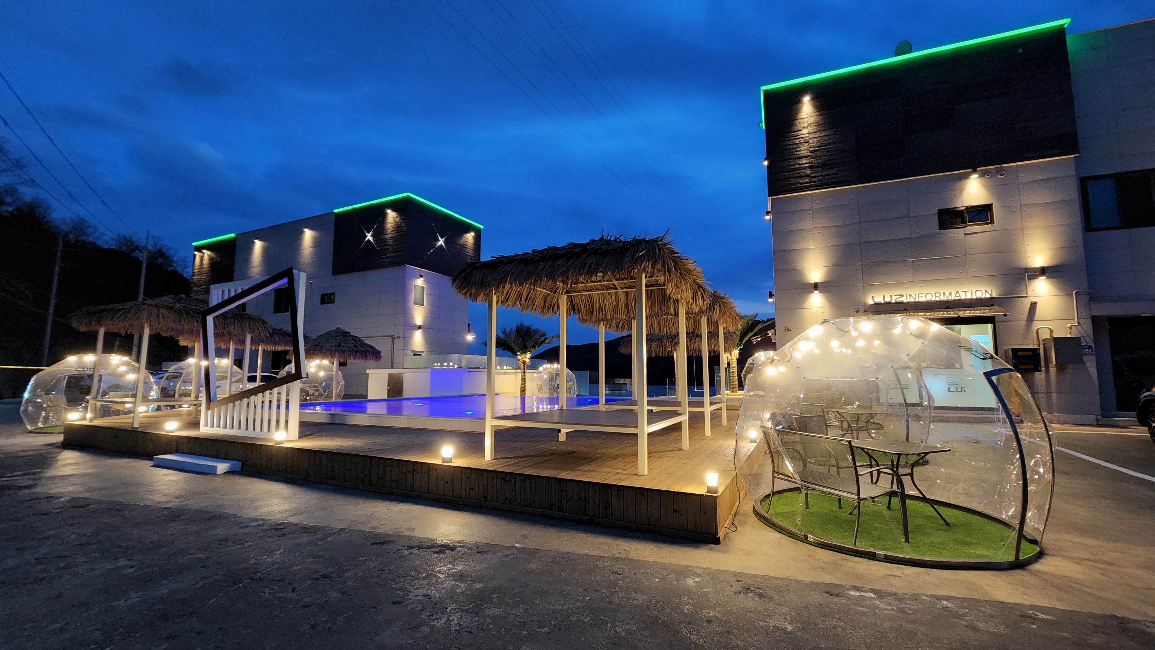 야간 풀의 모습을 살짝 볼까요. 중요한건 지금은 4월이고 물온도를 요청해야 하는데요, 직원분이 34도로 하는게 좋다고 해서 그렇게 했습니다. 이것도 비용을 지불해야 하는데, 12만원이 추가 지불 되었습니다.