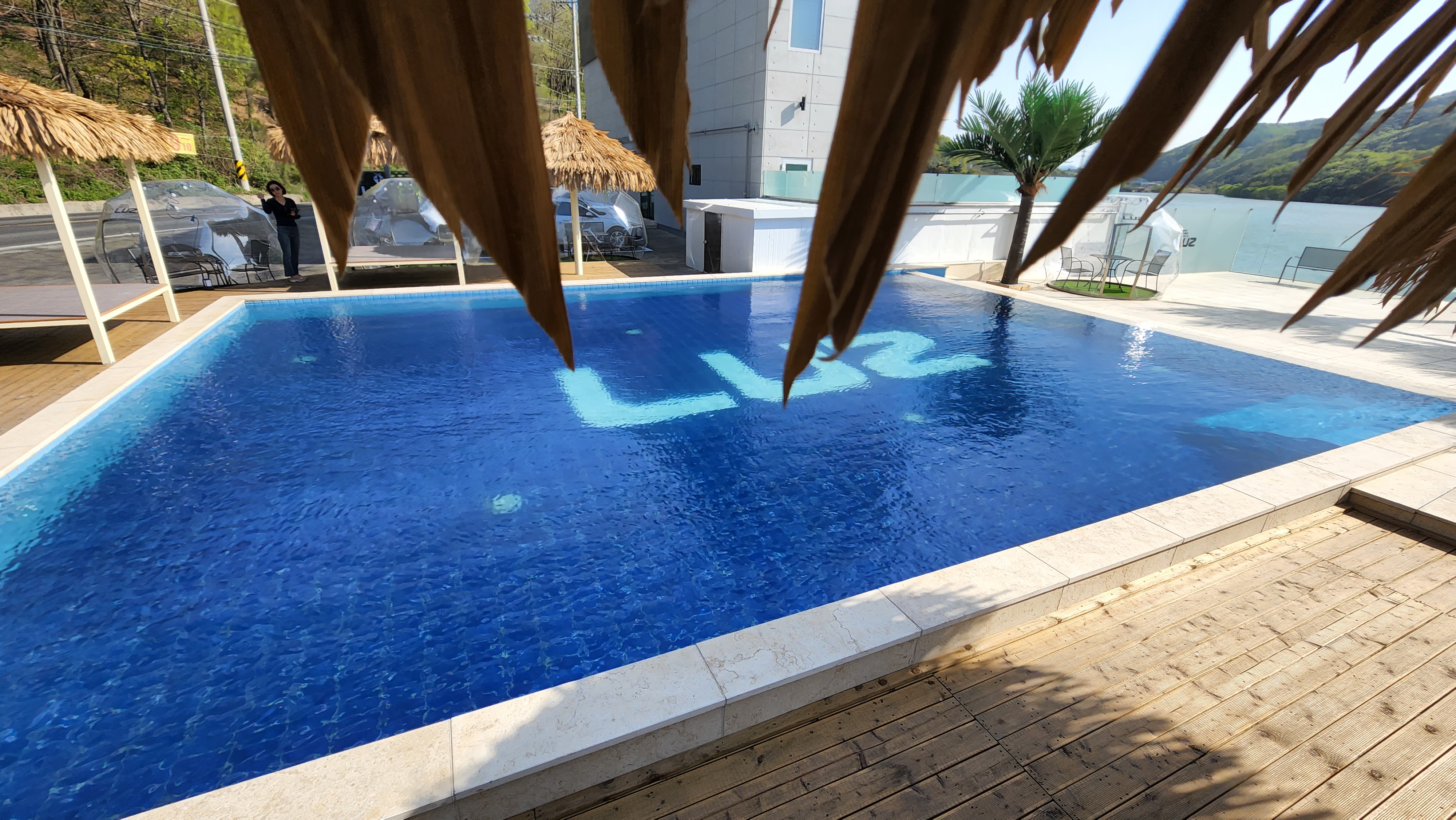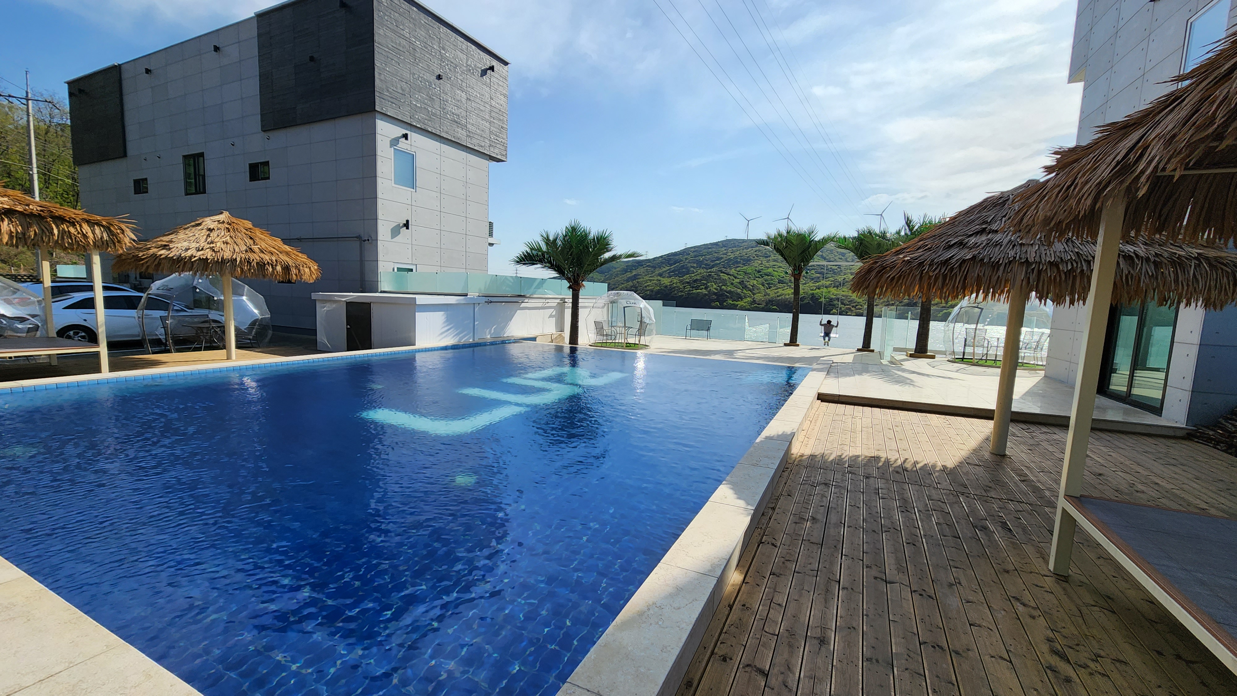 외부 풀을 가운데 놓고 오른쪽에 인포메이션이 있고, 앞으로 주차장 그리고 뒤로 강인지 호수인지 물이 흐르고 있어 뷰가 좋습니다.