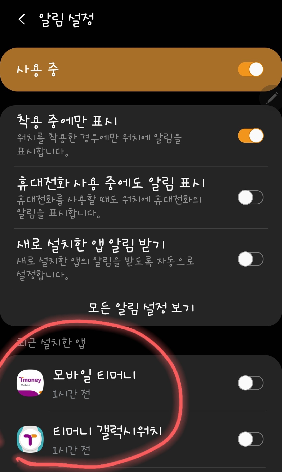 10. 다시 나가서 《알림 설정》에 가보면 이전 작업으로 티머니 어플이 설치된걸 확인할 수 있습니다.