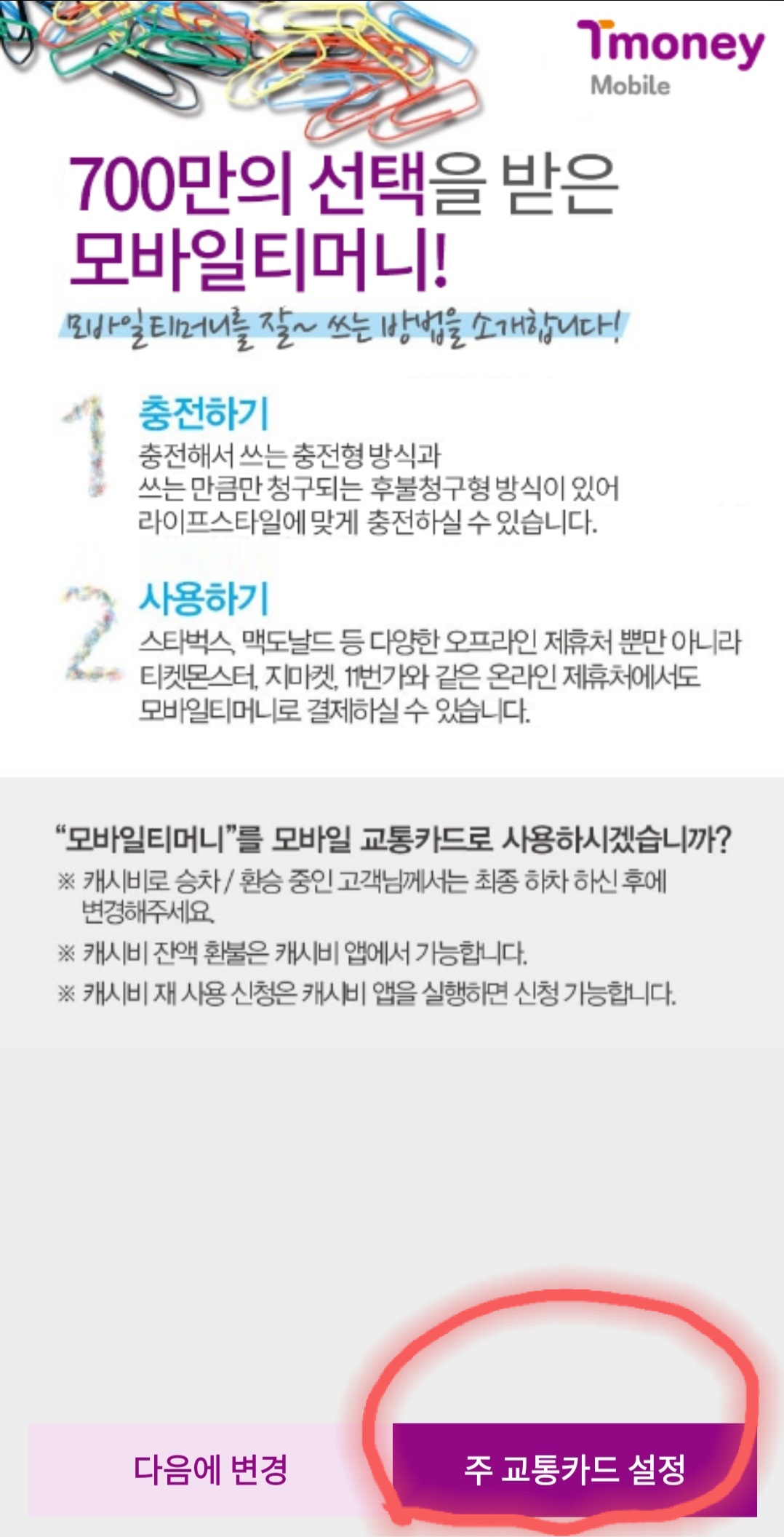 13. 여기까지를 하고나면 드디어 《스마트폰에 티머니 교통카드가 등장》합니다.