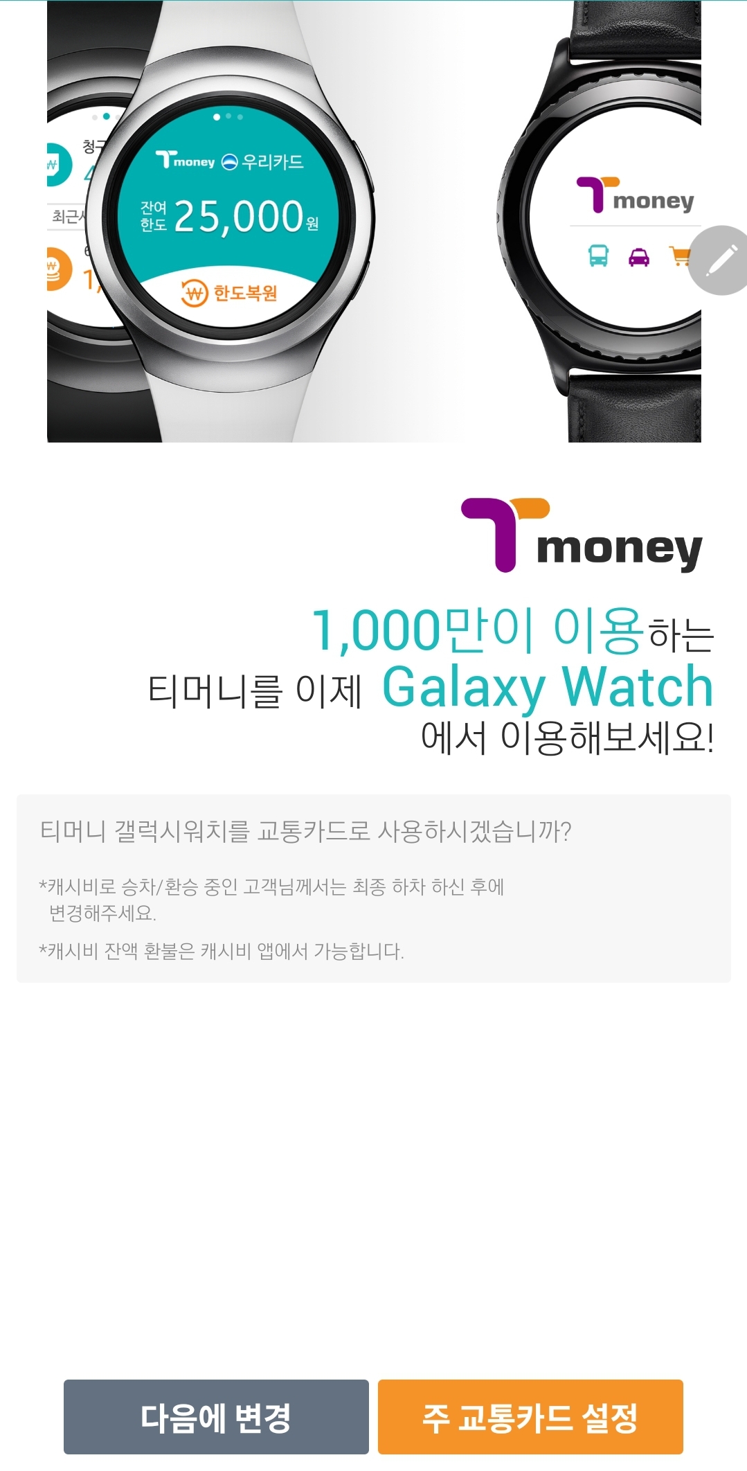 12. 티머니 모바일 앱에서 카드발급이 필요하다는 얘기입니다. 이미 스마트폰에 깔아둔 《티머니 갤럭시워치》어플로 갑니다.