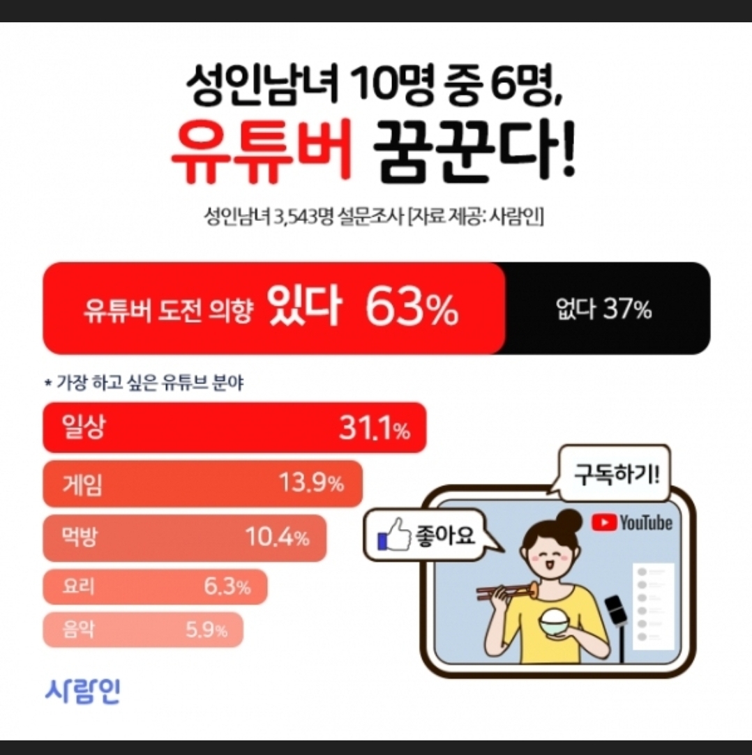 [컨슈머와이드-주은혜 기자] 우리나라 성인남녀 10명 중 6명이 ‘유튜버’가 꿈인 것으로 나타났다. 21일 사람인에 따르면, 성인남녀 3543명 중 63%가 ‘유튜버 도전 의향’을 가지고 있었다. 유튜