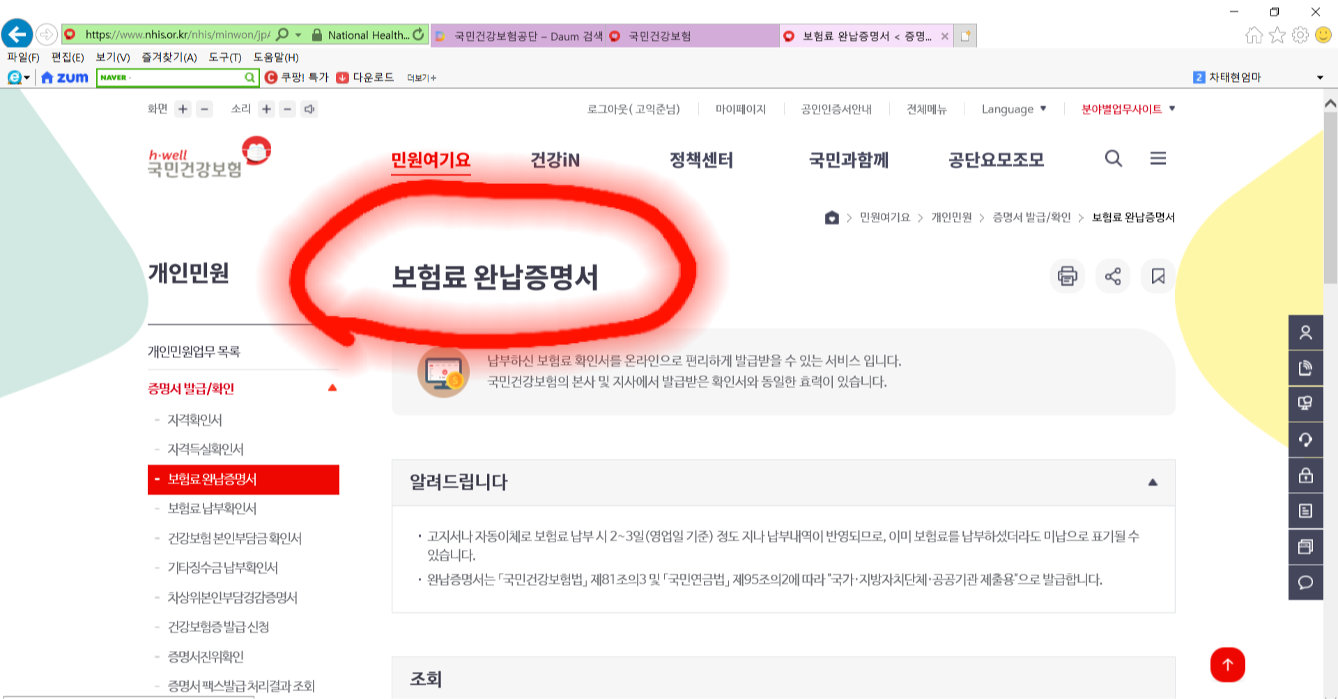 3. 개인민원이 열리면 아래에 있는 《보험료 완납증명서》를 클릭합니다.