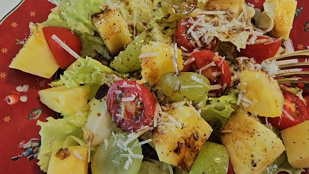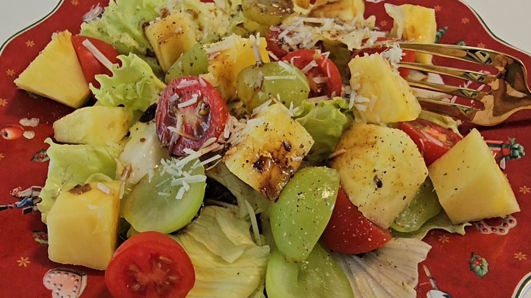 샐러드에 들어있는 다양한 채소와 과일은 비타민, 미네랄, 항산화 물질이 풍부하여 면역력을 높이고, 피부 건강을 유지하는 데 도움을 줍니다.