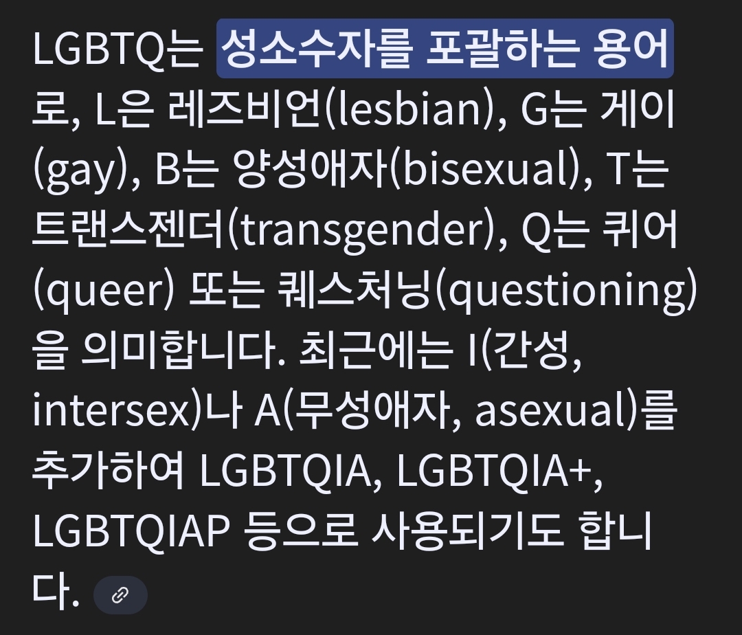 을 추가하여 LGBTQIA, LGBTQIA+, LGBTQIAP 등으로 사용되기도 합니다.