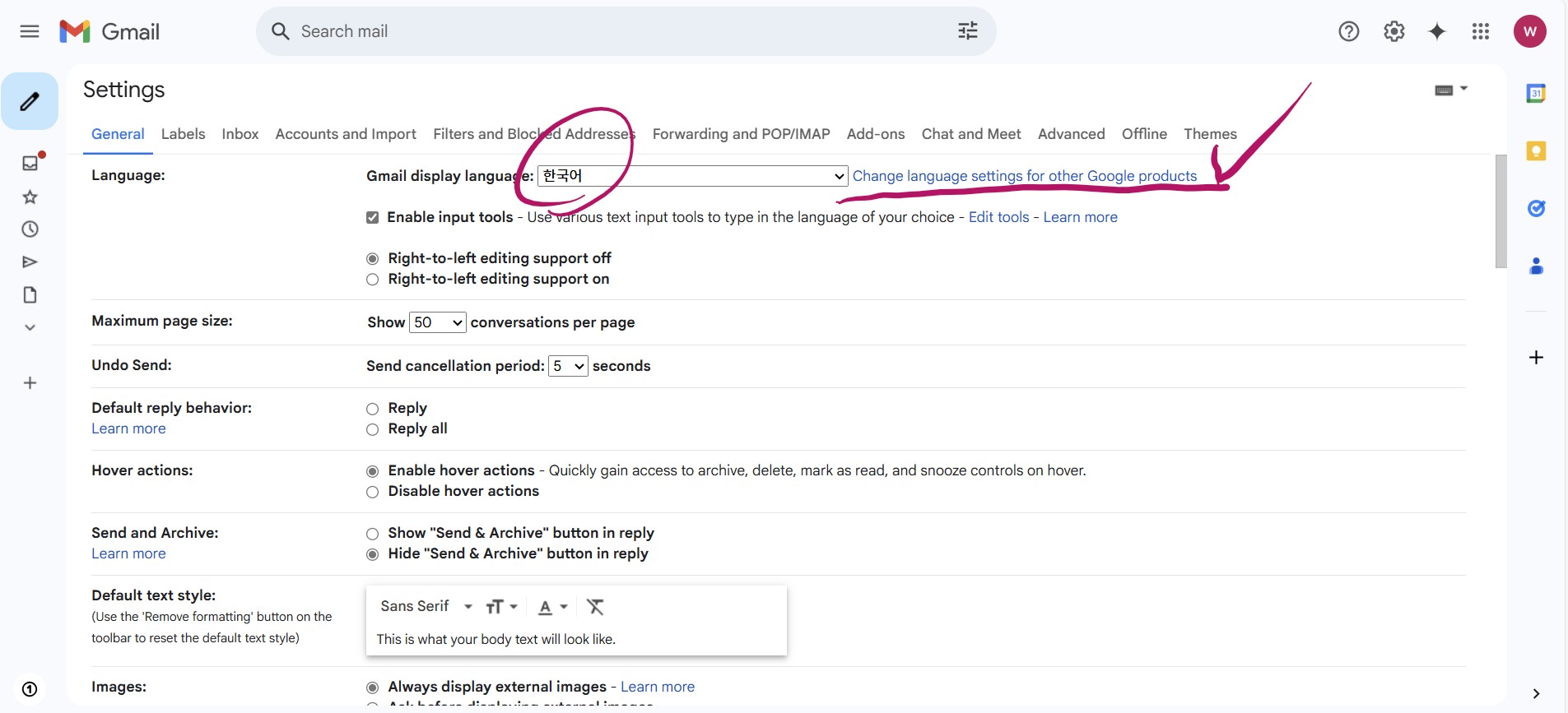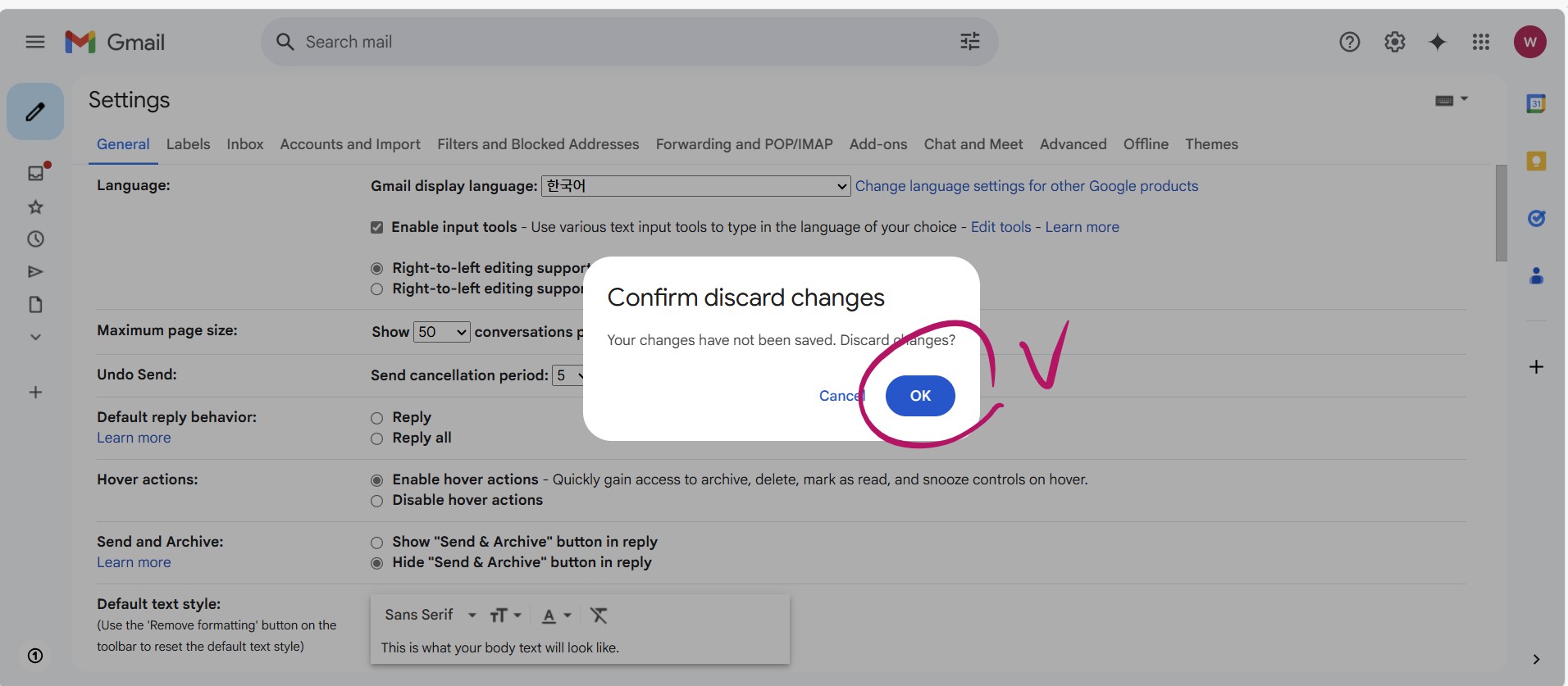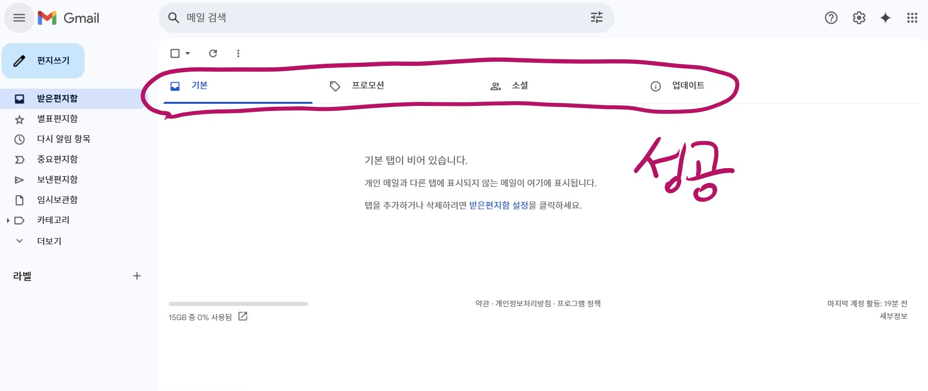 8. 그리고 다시 지메일로 돌아오면 한글로 바뀐 걸 볼 수 있을 겁니다. 적용이 늦어지는 경우도 있으니 그럴 경우 나갔다가 시간을 두고 다시 들어와서 확인해 보면 되겠습니다.