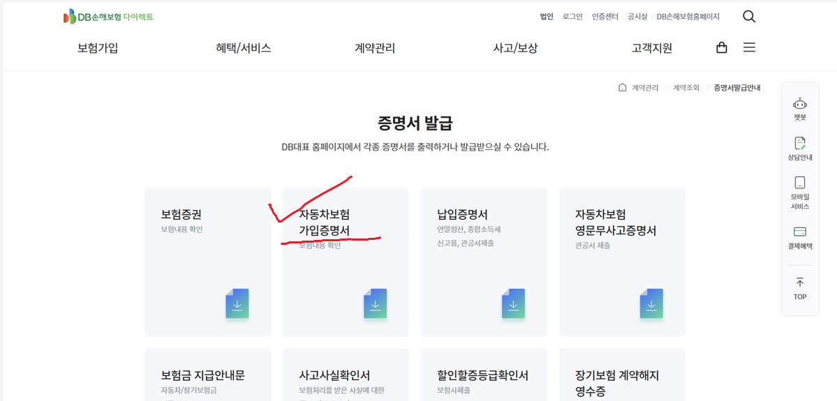 4. 자동차보험 가입증명서 항목을 선택한 다음, 지시에 따라 진행하면 됩니다