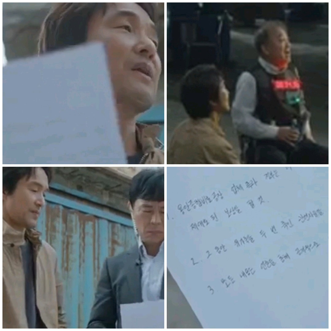 국밥이 도착하자 긴장된 분위기 속에서 이상현의 마음이 조금씩 누그러지고, 그는 본격적으로 자신의 요구사항을 털어놓습니다. 업체와 정부가 잘못을 인정하고 피해자들에게 정당한 보상을 할 것, 유가족을 두 번 죽인 관련자들을 엄중히 처벌할 것, 그리고 모든 내용을 언론을 통해 공개할 것, 이 세 가지가 받아들여지지 않으면 폭탄을 터뜨리고 그 과정을 인터넷으로 생중계하겠다고 선언합니다.