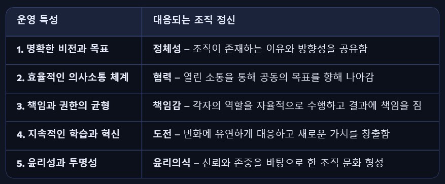 조직이 효과적으로 운영되기 위해 지켜야 할 핵심적인 5가지 특성과 정신