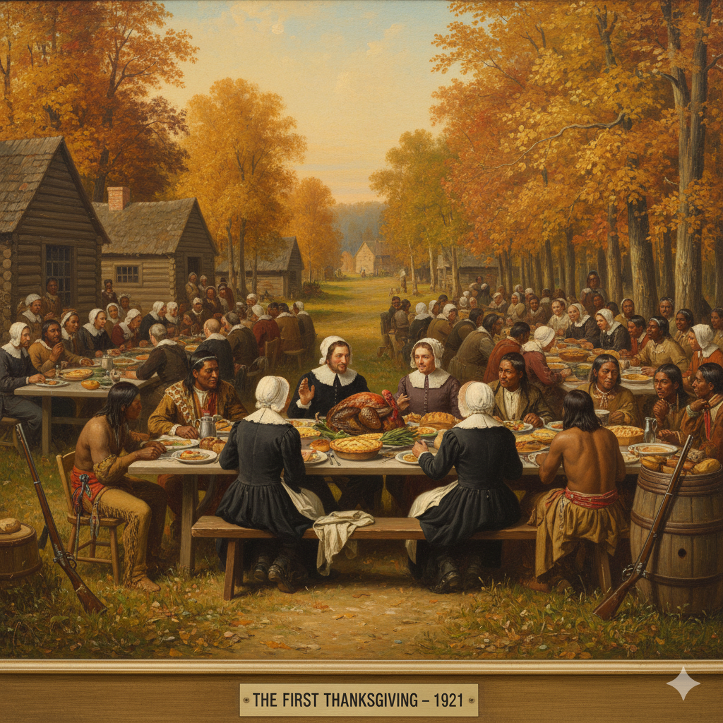 1621년 가을, 청교도들이 원주민의 도움으로 풍성한 옥수수와 작물을 수확하며 기뻐하는 모습입니다.