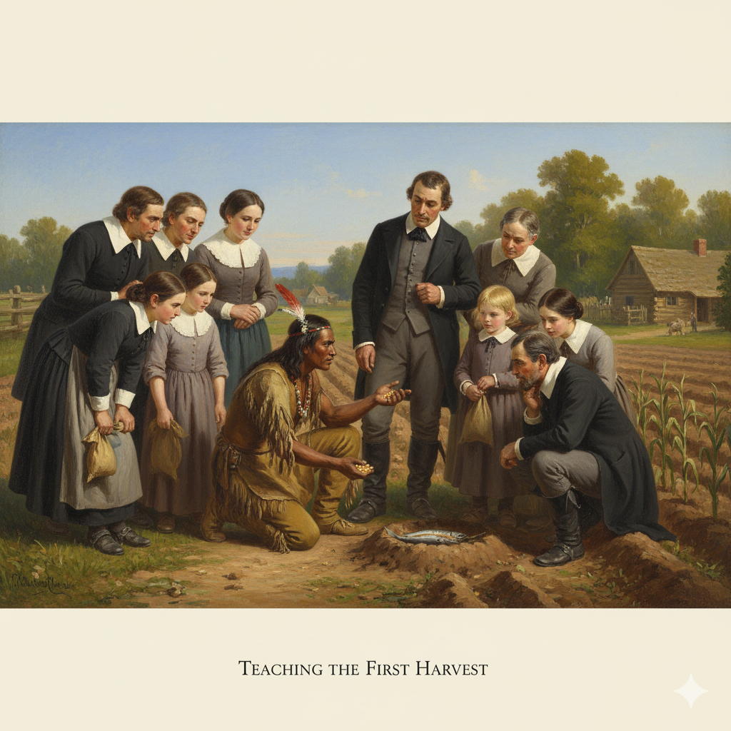 청교도들은 눈물을 흘리며 감사했단다. '우리를 살리신 것은 하나님의 은혜요, 스콴토와 이웃들의 도움 덕분이다!' 하고 말이야. 이분들은 신앙을 지키며 이 낯선 땅에 뿌리를 내리는 데 성공한 거지.