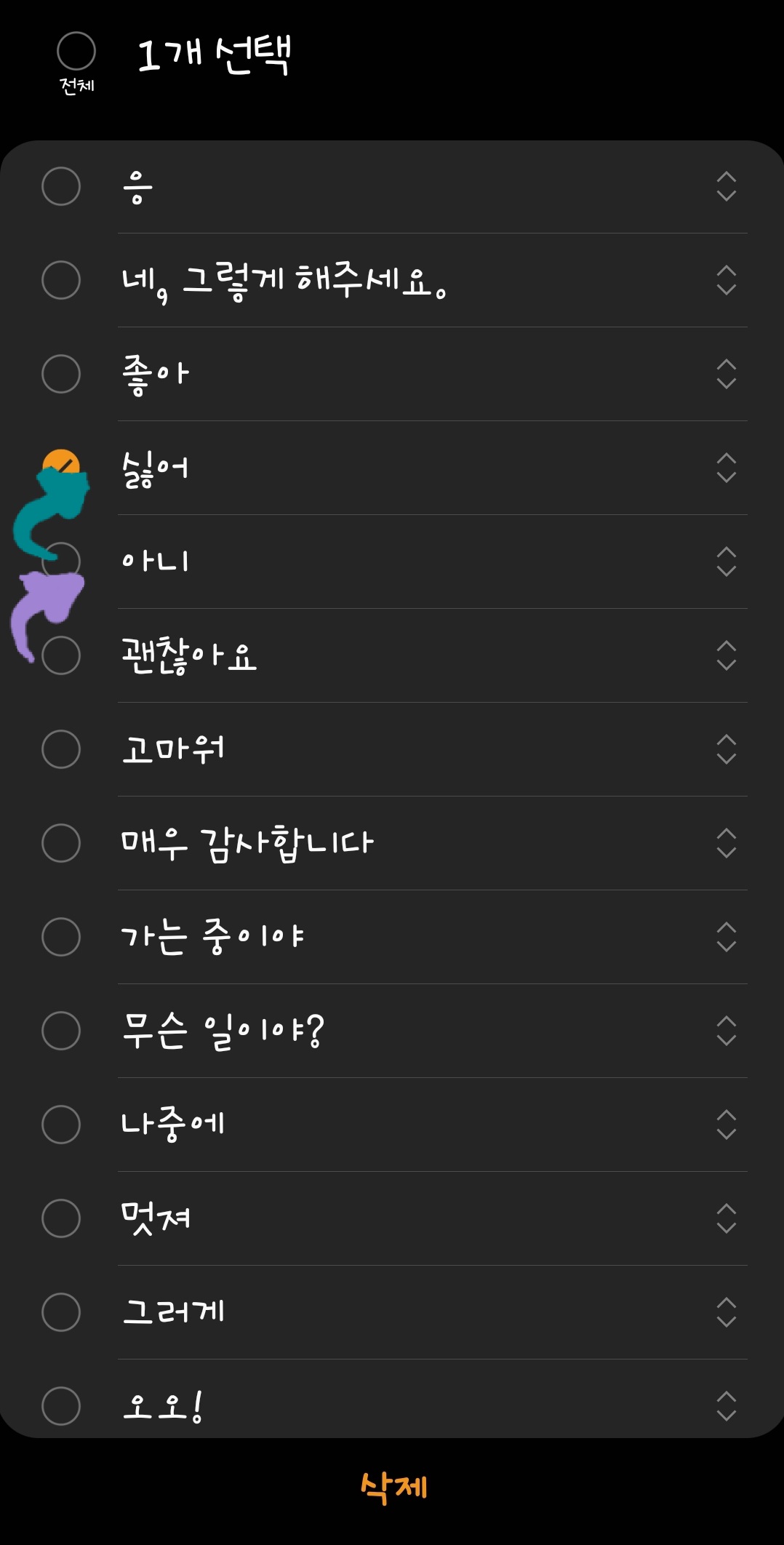 삭제하고 싶은 문장을 꾸욱~ 눌러 주면 왼쪽 앞에 노오란 체크가 등장합니다. 그리고 아래로 내려가면 삭제가 보일거에요. 누르면 바로 삭제된다는 건 아시죠👌